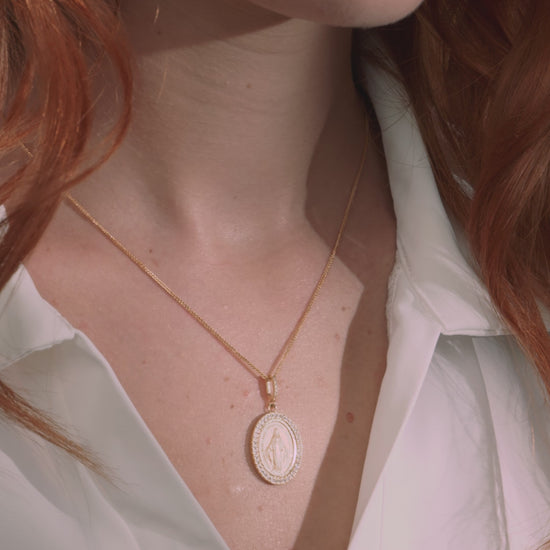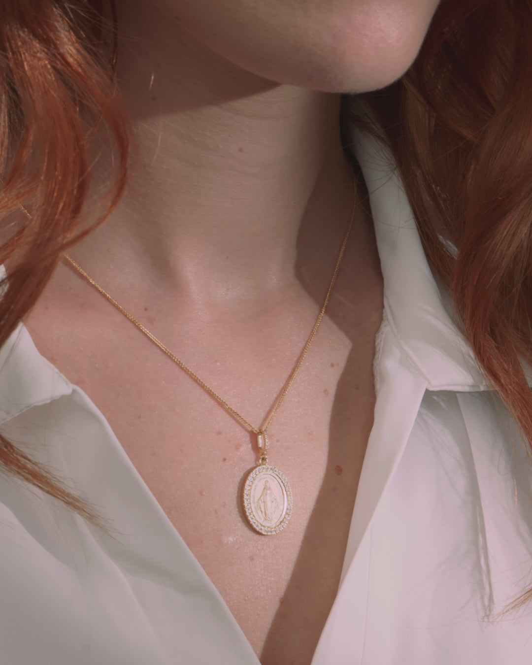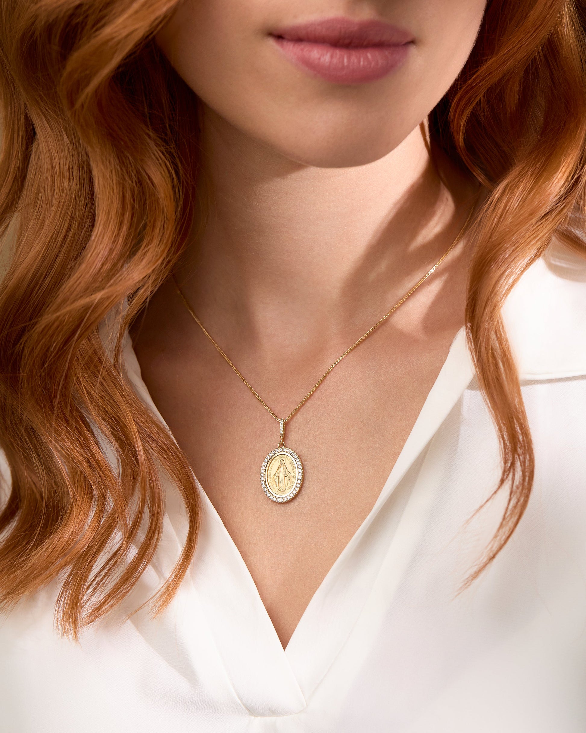 Medaglia dalla forma Ovale raffigurante la Madonna Miracolosa realizzata in Oro Giallo 18K, contorno e moschettone ideato con Zirconi Bianchi. Perfetta replica della medaglia originale commissionata dalla Vergine, apparsa a Santa Catherine Labourè, come segno di Amore, speranza e Grazia.
