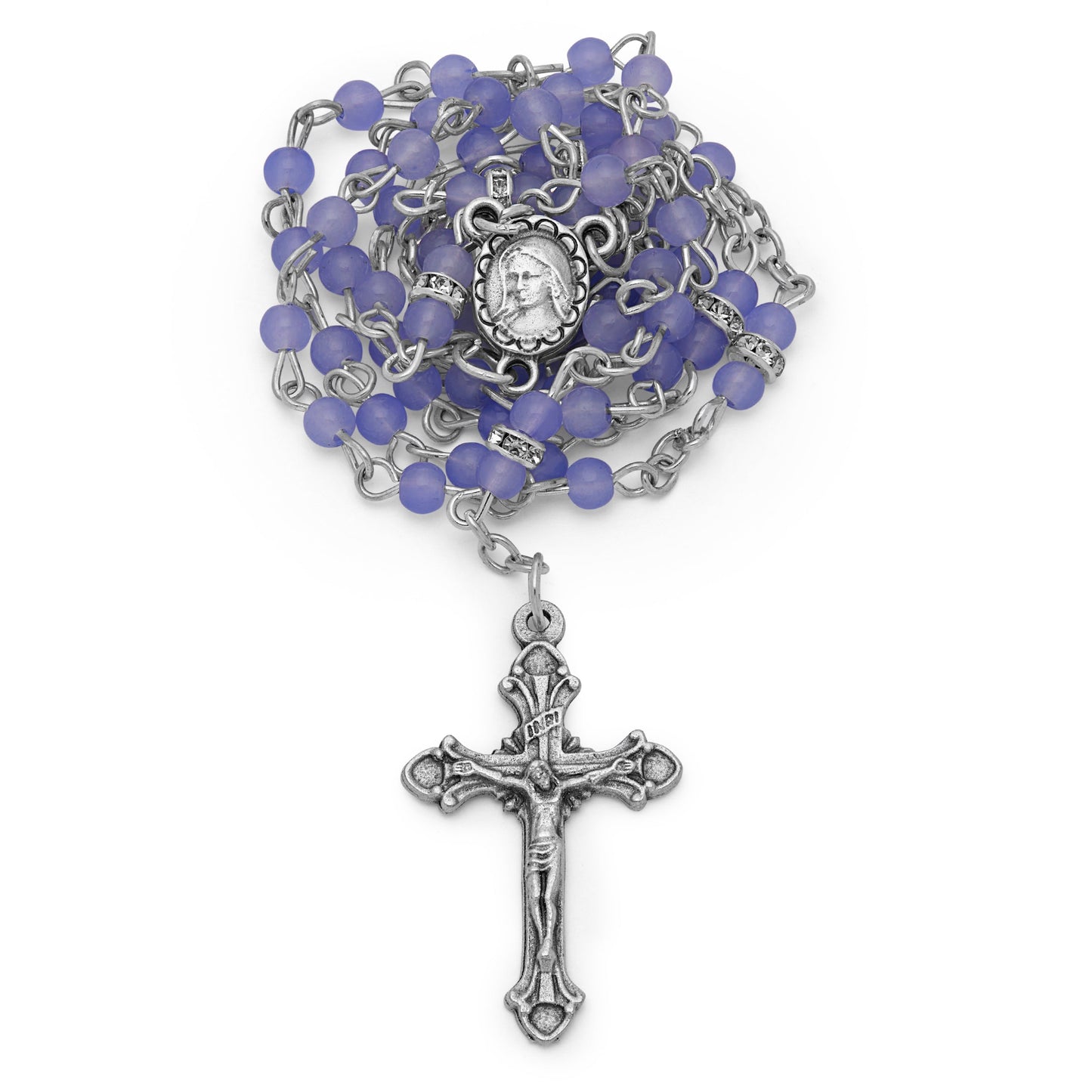 Rosario della Madonna delle Grazie, grani da 3mm, colore viola, Padre Nostro formato da due grani di 3mm uniti da una rondella con strass, crociera rappresentante la Madonna Miracolosa.
