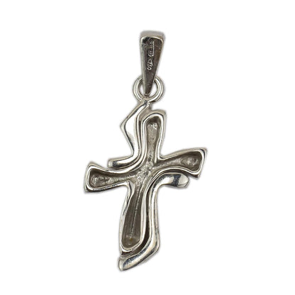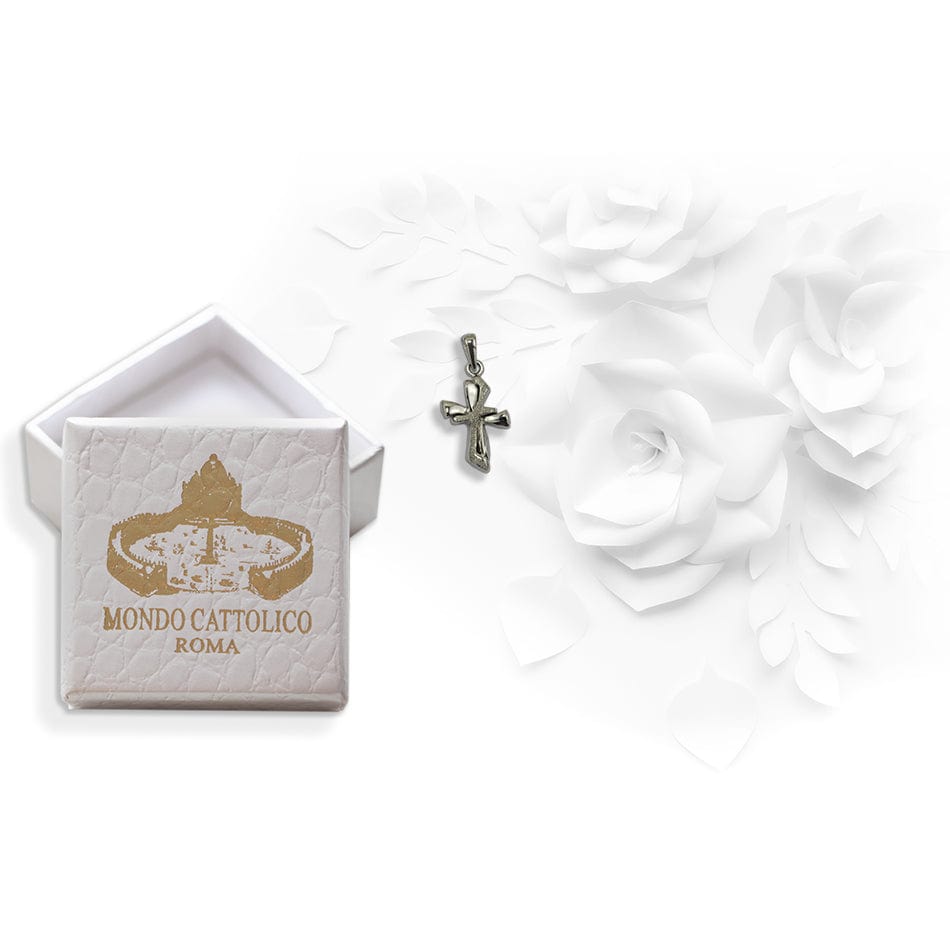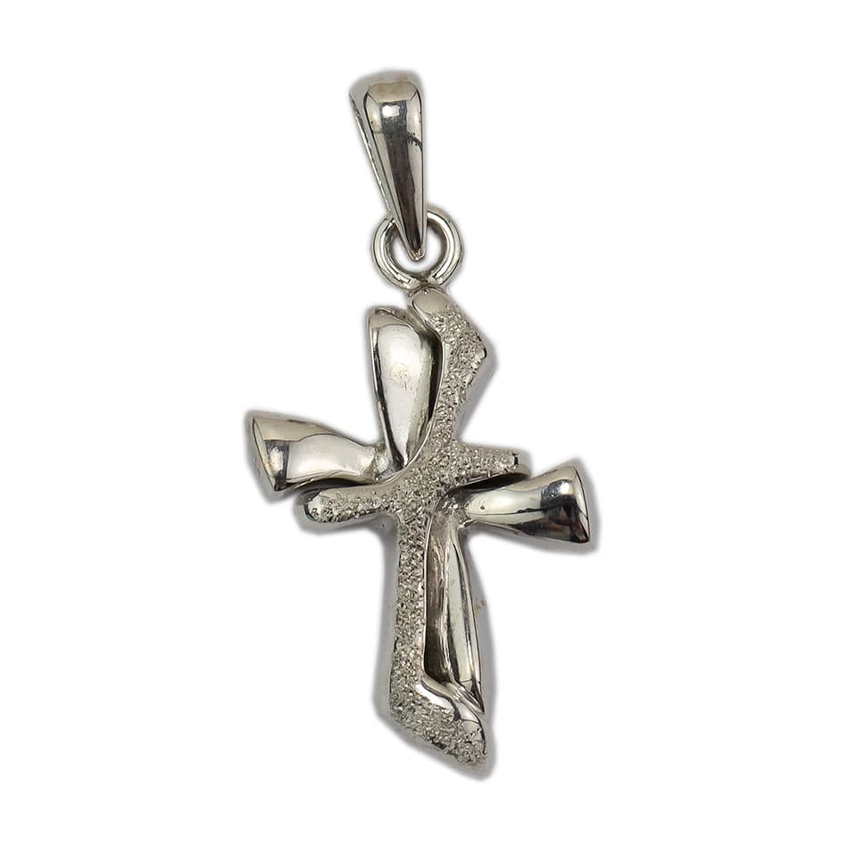 Pendente Croce Moderno Oro Bianco 18kt. Questo particolare ciondolo vanta una linea flussuosa, moderna ed è leggermente Diamantato.