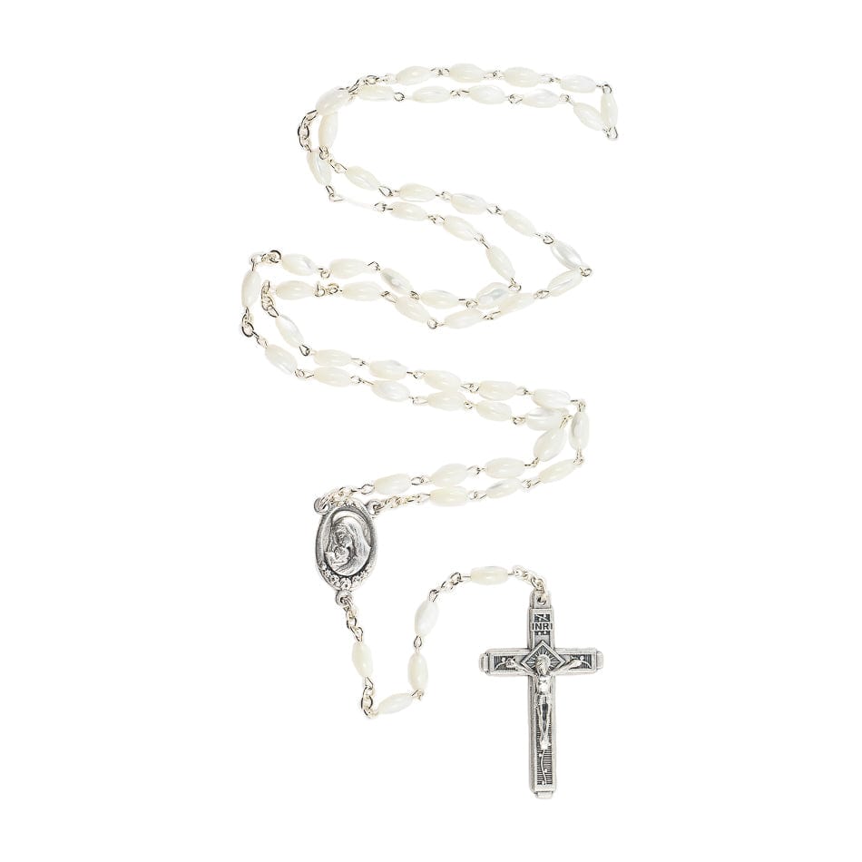 Rosario composto da grani ovali in Madreperla, crociera doppia raffigurante la Madonna col Bambino e Piazza San Pietro,.