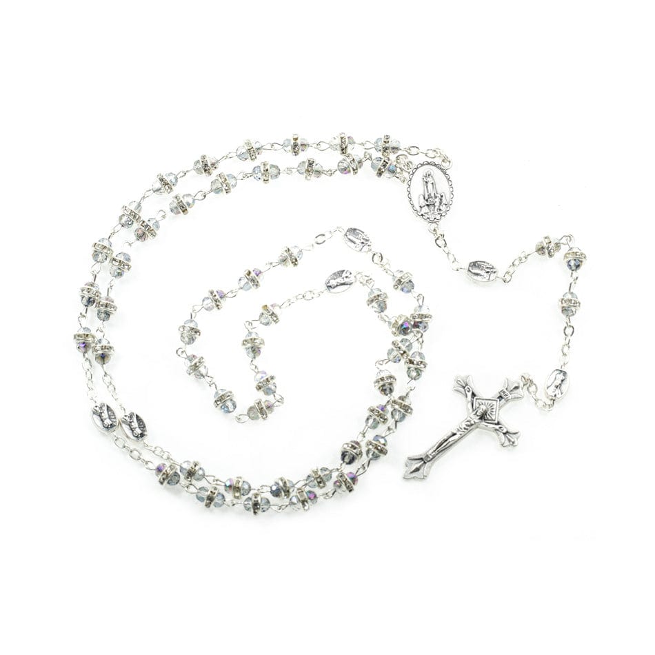 Rosario in cristallo, grani composti da rondelle con strass, crociera della Madonna di Fatima, colore argento.