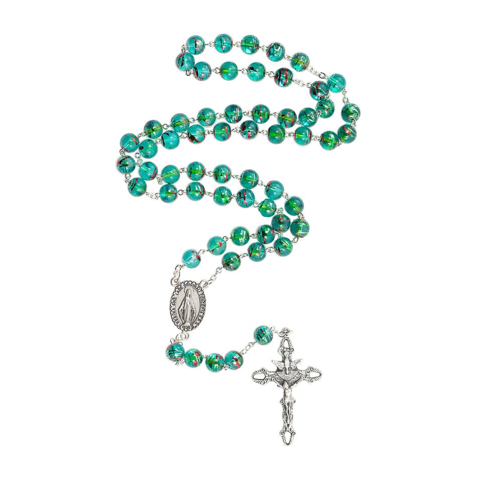 Rosario in vetro boemo, piccolissime venature verdi e rosse su grano color verde smeraldo, crociera raffigurante la Vergine Miracolosa, croce in filigrana di peltro.
