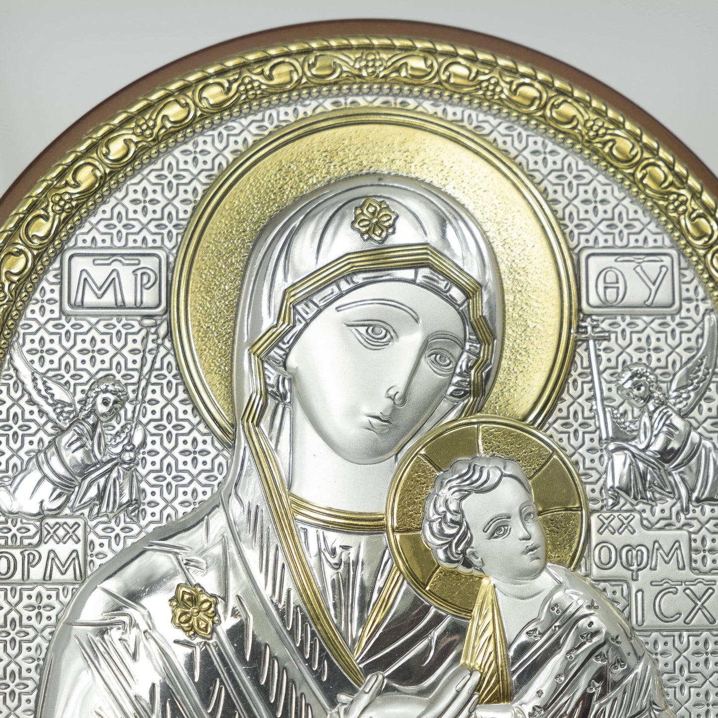 La presente opera religiosa è realizzata su lastra di Argento 925 supportata da un metallo comune, utilizzando tecniche all'avanguardia del settore della lavorazione artigianale dei metalli preziosi. Il quadro raffigura la Madonna del Perpetuo Soccorso ed Angeli con dettagli dorati, applicato su legno pregiato. E' predisposto al doppio uso, possibile utilizzo sia da tavolo che da parete. Disponibile in due diverse misure.