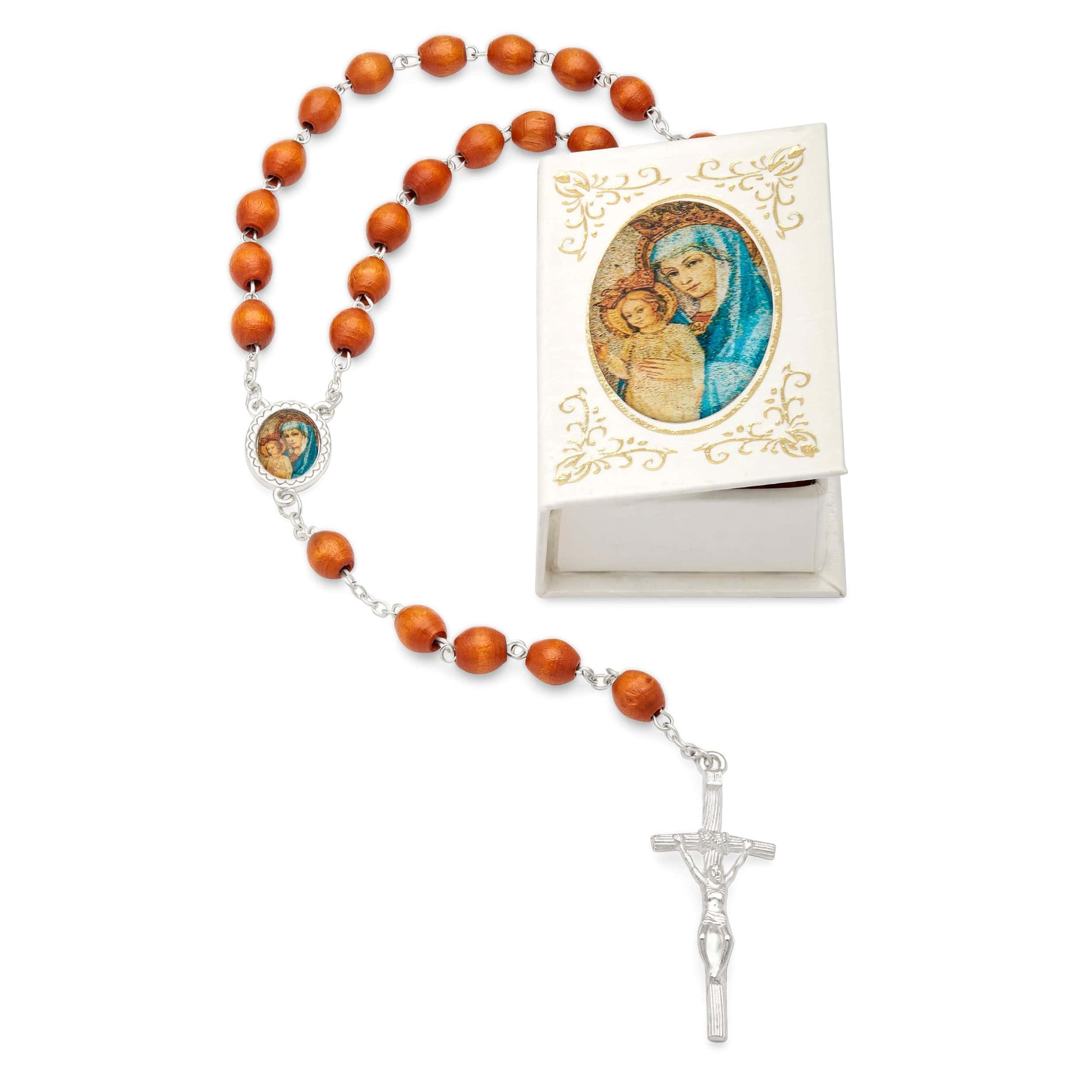 Scatolina portarosario a forma di libro con la Mater Ecclesiae, rosario in legno con la Madonna, grani ovali da 7mm, crociera della Mater Ecclesiae, croce Pastorale.