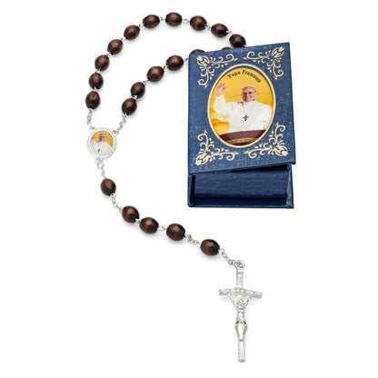 Scatolina a forma di libro con sticker di Papa Francesco contenente rosario con la crociera del Papa, grani ovali marroni da 7mm, croce Pastorale.