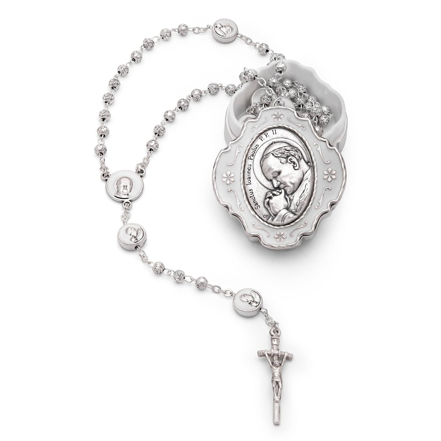 Portarosario Smaltato Bianco Di Papa Giovanni Paolo II Con Rosario Con Grani a Forma Di Rosa
