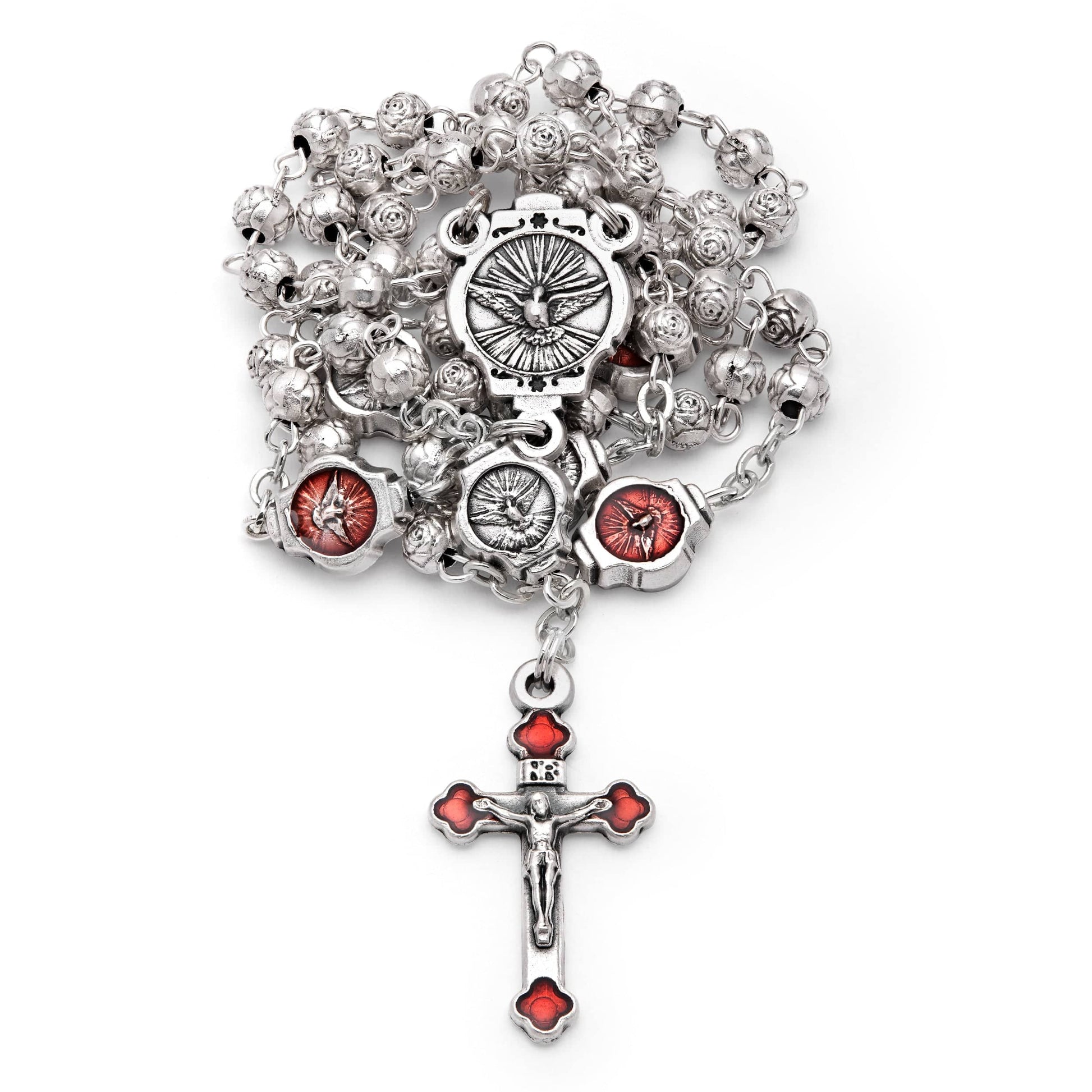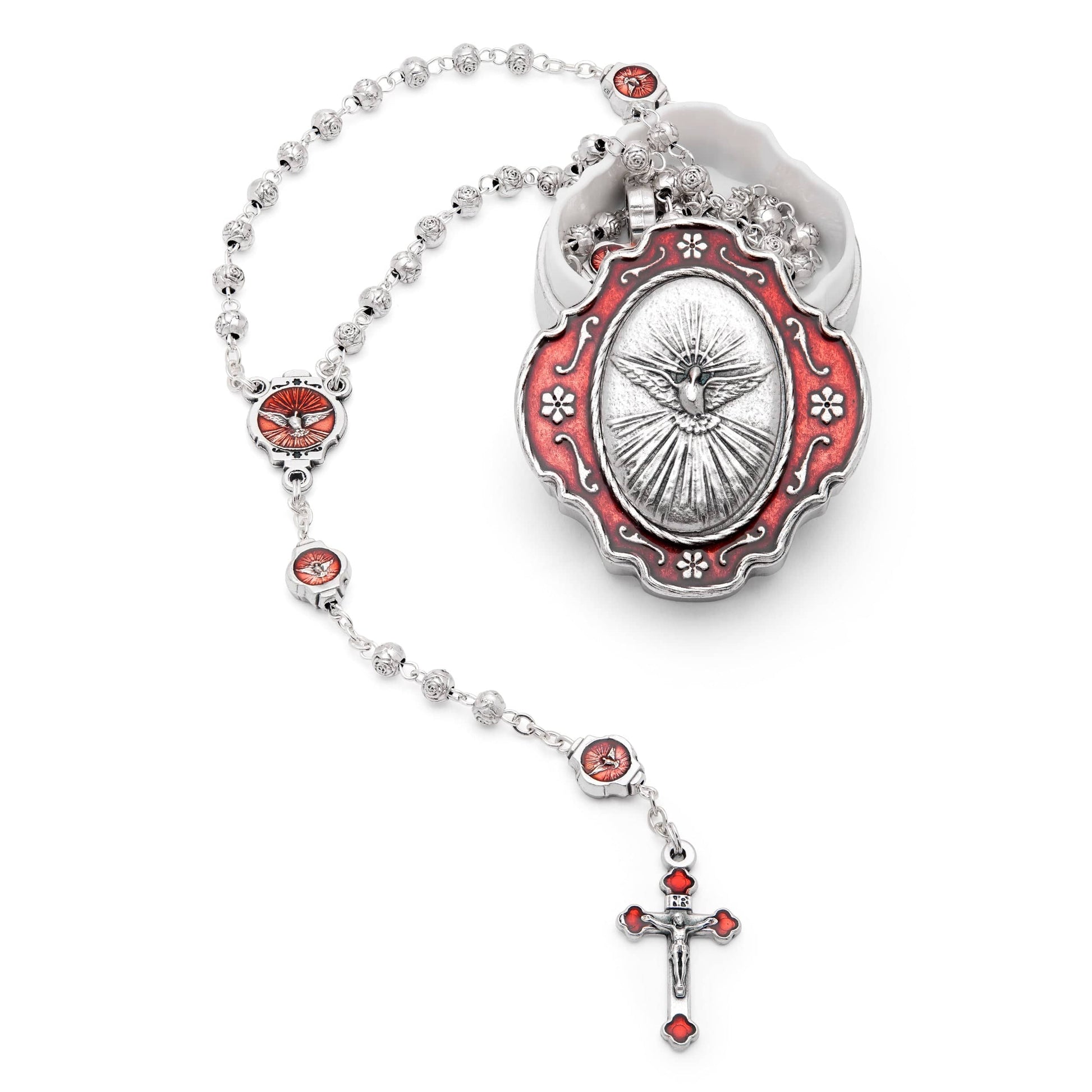 Portarosario Smaltato Rosso Dello Spirito Santo Con Rosario Con Grani a Forma Di Rosa