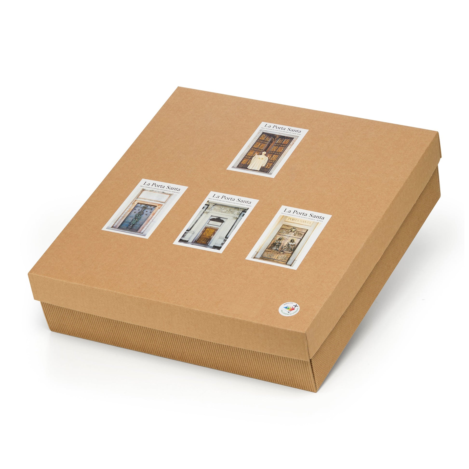 Questa elegante raffigurazione in ottone presenta le Quattro Porte Sante di Roma, nello specifico le Porte del Giubileo della Basilica di San Pietro, San Giovanni in Laterano, Santa Maria Maggiore e San Paolo fuori le mura. Simbolo del cammino spirituale dei pellegrini durante il Giubileo 2025, ogni Porta Santa rappresenta un invito al rinnovamento, al perdono e alla grazia. Inserita su un raffinato supporto da appoggio in plexiglass, quest'opera è un significativo ricordo commemorativo dell'evento straordinario del Giubileo.