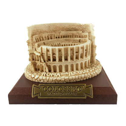 Miniature el Colosseo in resina, base in legno con iscrizione Colosseo, scatolina cartacea.