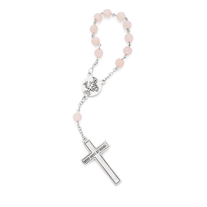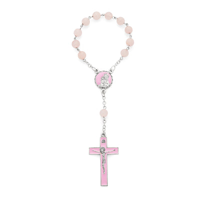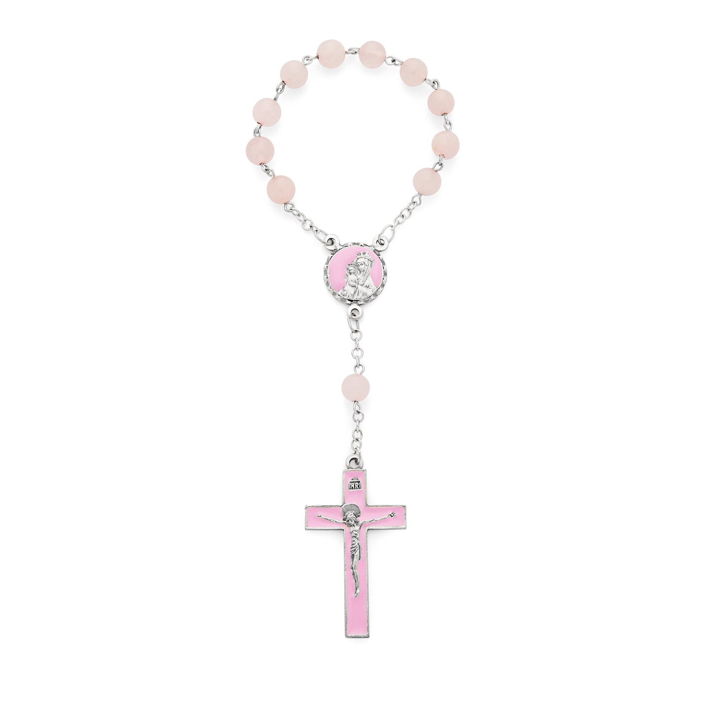 Rosario Decina con Grani in Quarzo Rosa con Crociera e Crocifisso Smaltati Rosa