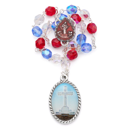 Elegante coroncina composta da sette poste, dedicata alla recita delle preghiere fondamentali della fede cristiana: Padre Nostro, Ave Maria e Gloria al Padre. Si inizia con il Segno della Croce e il Credo sulla croce, seguito dal Padre Nostro sui grani celesti, l’Ave Maria sui grani bianchi e il Gloria sui grani rossi. La preghiera finale invoca la grazia e la fedeltà al Signore nella Santissima Trinità. Raccomandata dalla Madonna a Medjugorje come ringraziamento dopo la Santa Messa, questa pratica è ideale da recitare ogni giorno per rafforzare la fede e rendere gloria a Dio.