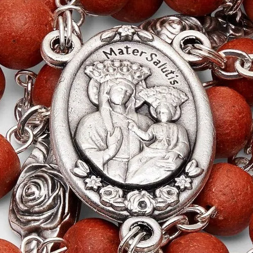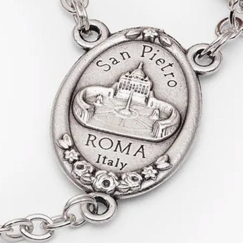 Ogni Padre Nostro è segnato da una raffinata rosa in metallo, un omaggio delicato alla Vergine Maria. Al centro, una crociera unica raffigura la Madonna della Salute, potente intercessora nelle malattie, con Piazza San Pietro incisa sul retro, simbolo dell’abbraccio universale della Chiesa.