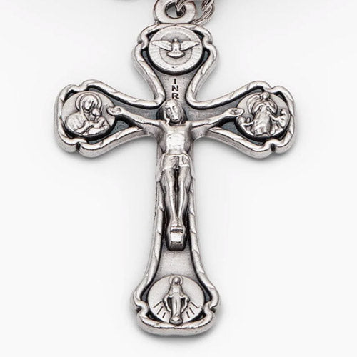 Il crocefisso è ricco di significati: rappresenta lo Spirito Santo, la Medaglia Miracolosa, Maria che scioglie i nodi e la Madonna col Bambino. Sul retro, l’incisione delle quattro basiliche papali di Roma, radici spirituali della fede cattolica.