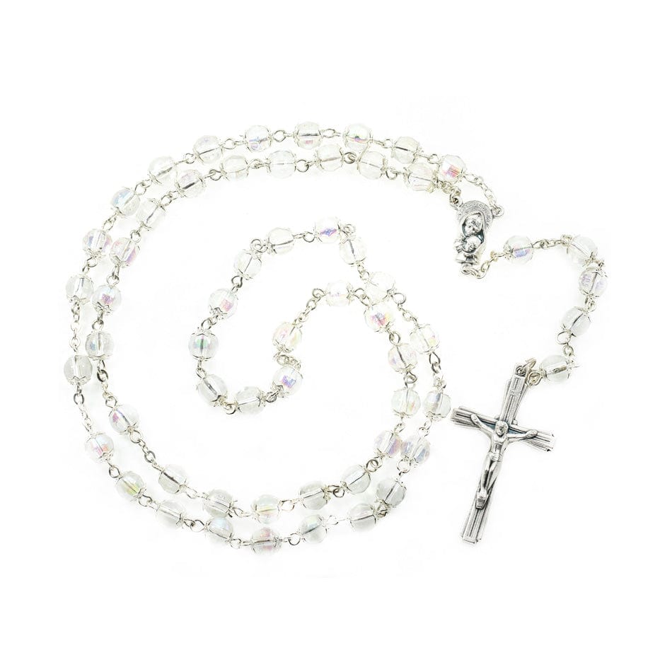 Rosario in vetro accoppigliato bianco e crociera con la Madonna.