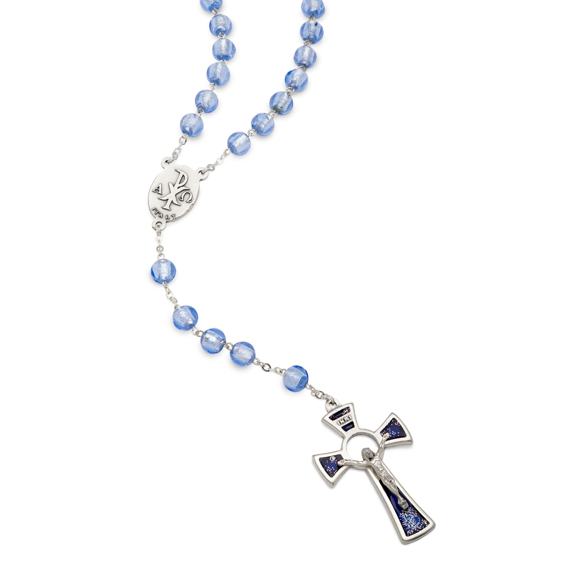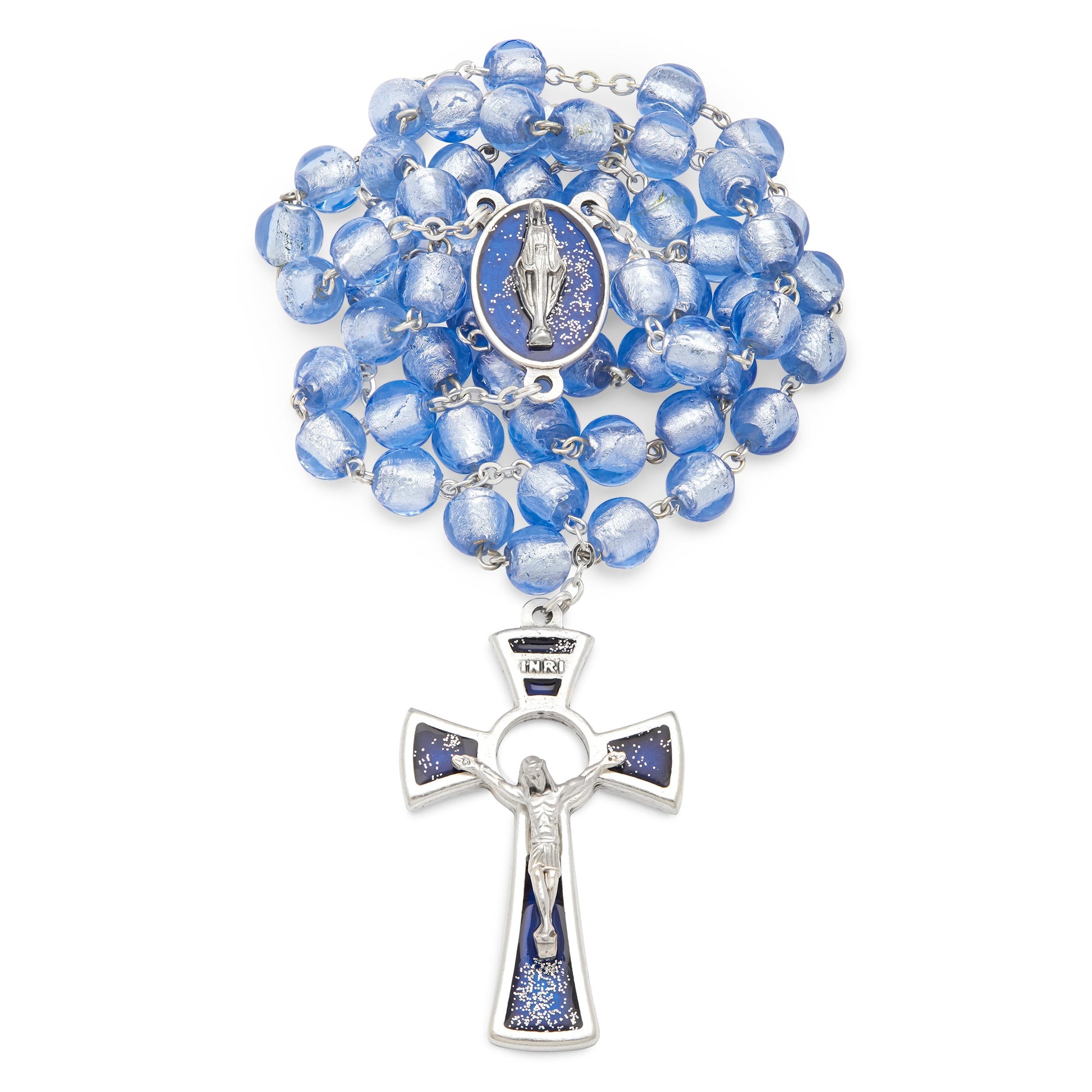 Un rosario finemente lavorato, realizzato a Civitanova Marche. È composto da cinque decine in vetro veneziano. Facili da maneggiare durante le preghiere, questi grani mostrano le caratteristiche pregiate di questo vetro: eleganza e delicatezza unite alla praticità. La catena è robusta e resistente. La medaglia centrale raffigura la potente Vergine Miracolosa su uno sfondo smaltato e luccicante. Il crocifisso, anch'esso su uno sfondo scintillante, si integra perfettamente con il design del rosario.