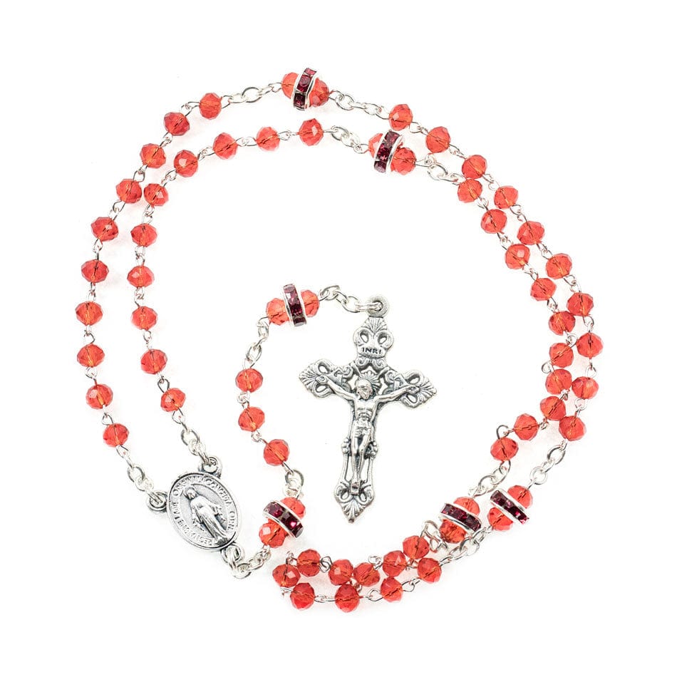 Rosario con grani in Vetro, pater con le ghiere di Strass, con chiusura, colore rosso.