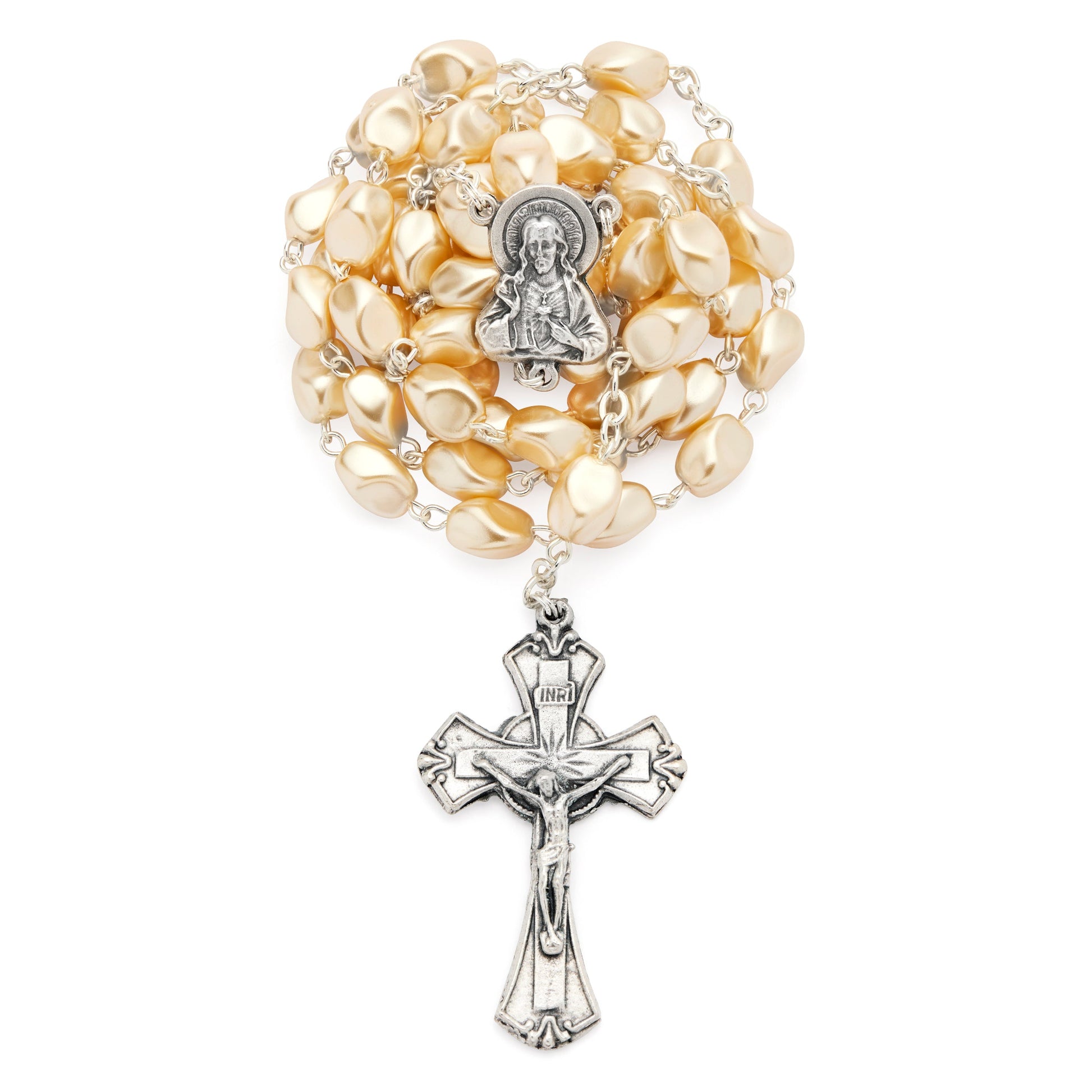 Rosario composto da grani in vetro perlato, crociera con lo scapolare, Sacro Cuore di Gesù e la Madonna del Carmelo.