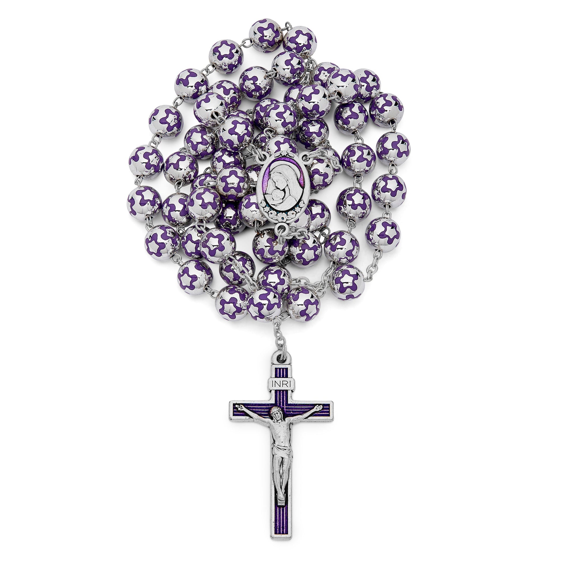 Rosario del Sacro Cuore di Gesù con Grani Color Argento Decorati con Fiori Viola