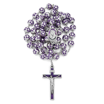 Questo elegante rosario in tonalità argento presenta grani rotondi, ognuno con una base liscia decorata con delicati fiorellini viola al centro. I grani brillano splendidamente alla luce, unendo la lucentezza dell’argento alla profondità del viola. La catena è solida e resistente, pensata per l’uso quotidiano. Al centro, la medaglia smaltata bifacciale raffigura da un lato il Sacro Cuore di Gesù e dall’altro la Vergine Maria con il Bambino Gesù, entrambi rifiniti con smalto viola coordinato. Anche il grande crocifisso è smaltato in viola, creando un design armonioso e raffinato.
