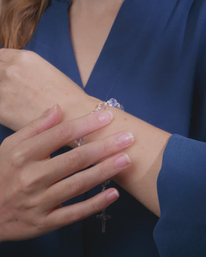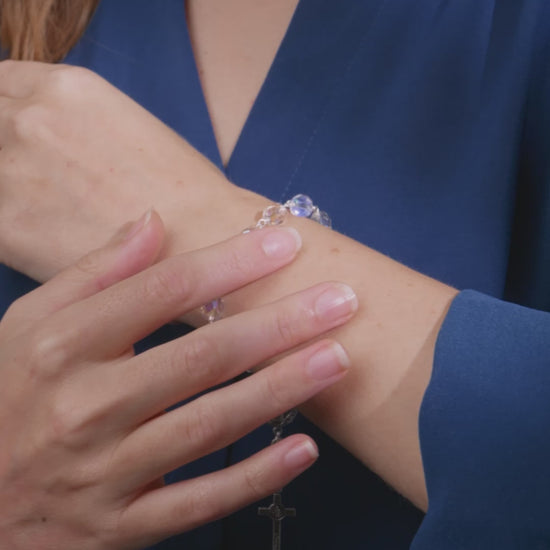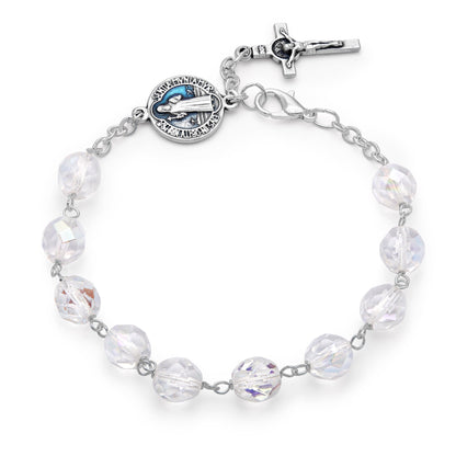 Bracciale rosario di San Benedetto con grani di cristallo di 8 millimetri. Medaglia rotonda smaltata di San Benedetto. Crocifisso di San Benedetto.