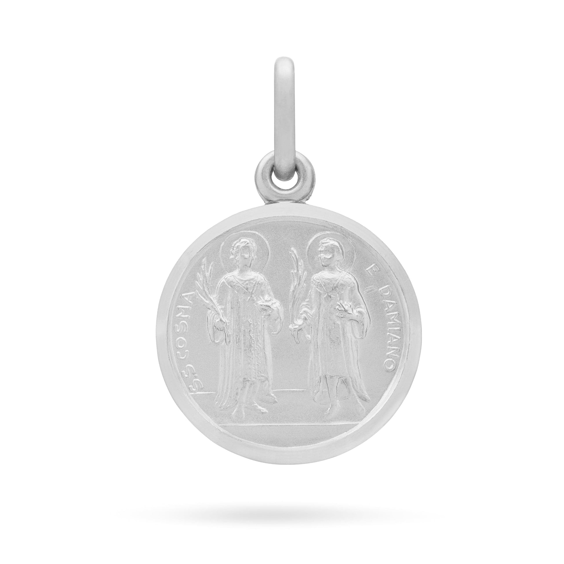 Medaglia di San Cosma e San Damiano in argento 925. I Santi martiri Cosma e Damiano furono fratelli gemelli e non solo di sangue, anche di fede e di martirio. Animati da vero spirito di fede e di carità si servirono della loro arte per curare sia i corpi sia le anime con l'esempio e con la parola. Protettori dei chirurghi, dentisti, farmacisti e medici.
