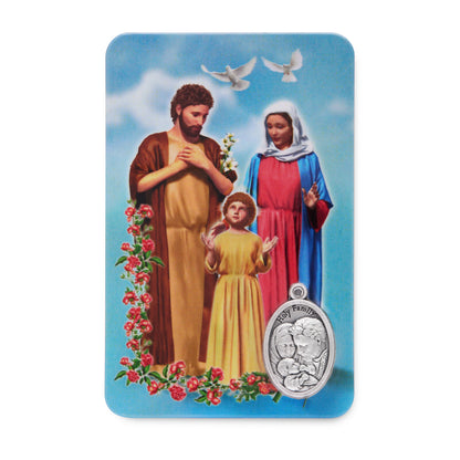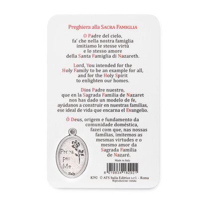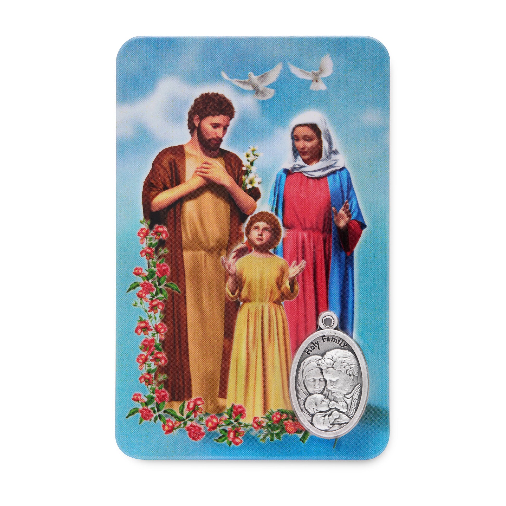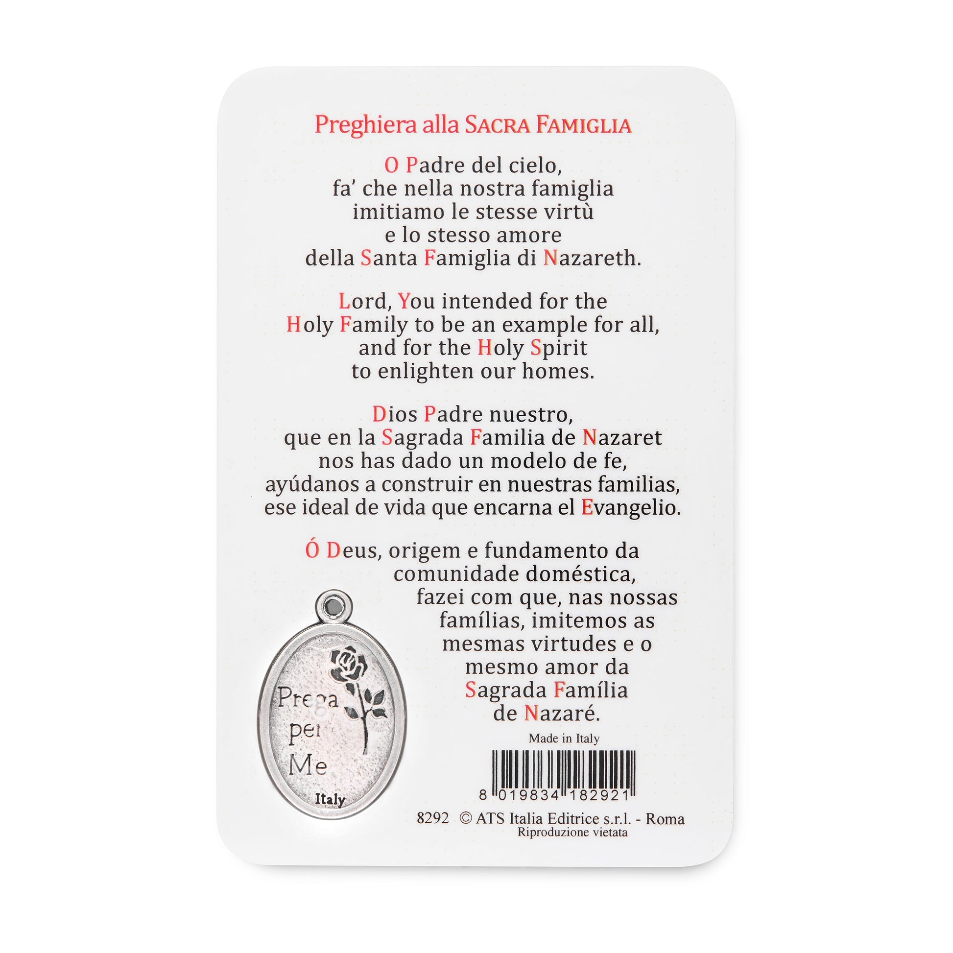 Questo santino resistente presenta una serena e dettagliata immagine della Sacra Famiglia, protetta da una plastificazione durevole. Simbolo di amore, unità e modello di vita familiare, la Sacra Famiglia ispira devozione e fede nella vita quotidiana. Il santino include una medaglia in metallo finemente incisa con la loro immagine, rendendolo un oggetto devozionale significativo o un regalo speciale.