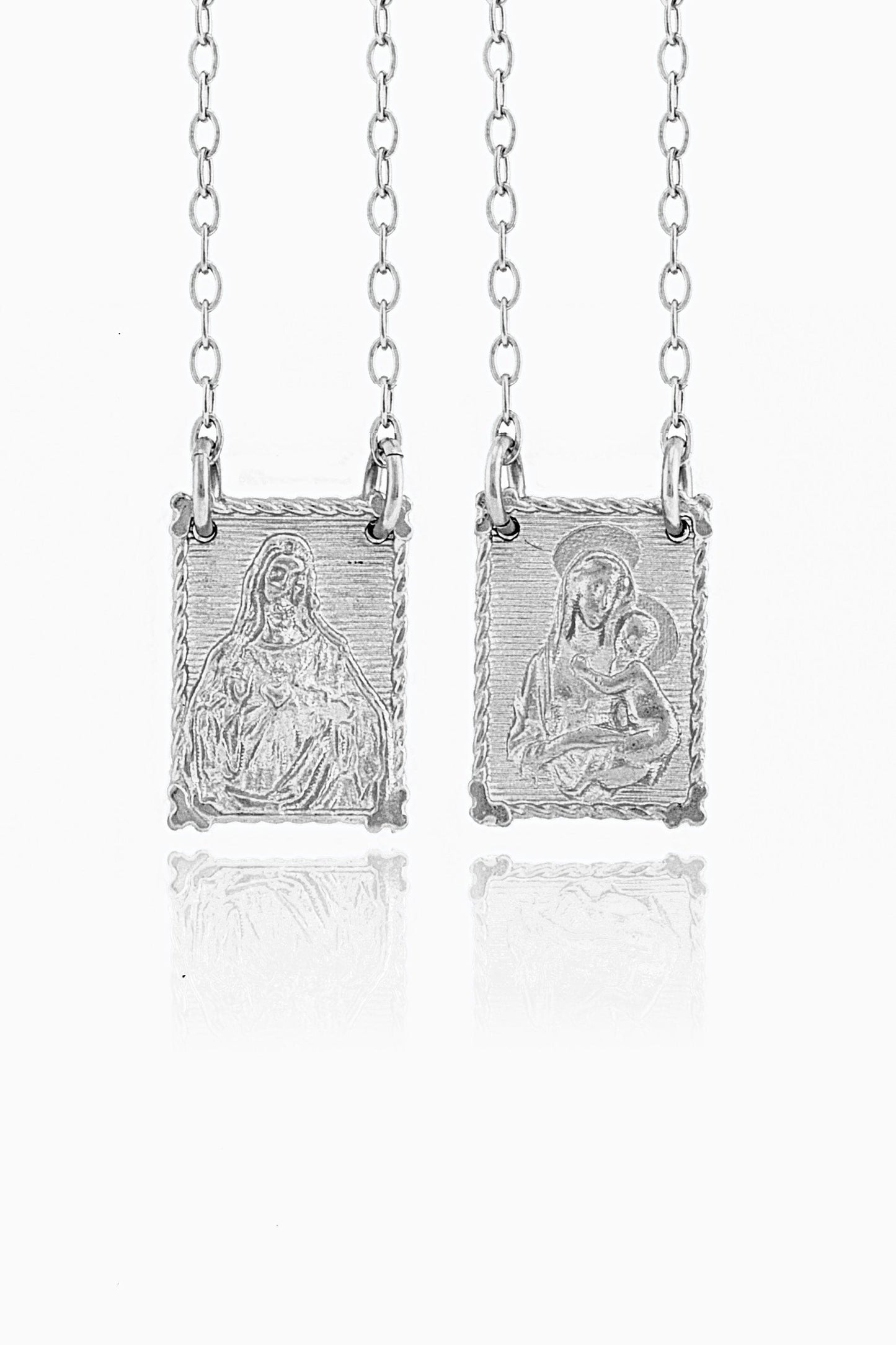 Collana Scapolare in argento 925. Lo scapolare era in origine un abito, indossato in alcuni ordini religiosi, che copriva spalle, schiena e ventre per proteggere gli abiti ordinari. Nel tempo ha assunto la forma attuale, con le immagini di Gesù e della Madonna del Carmelo.