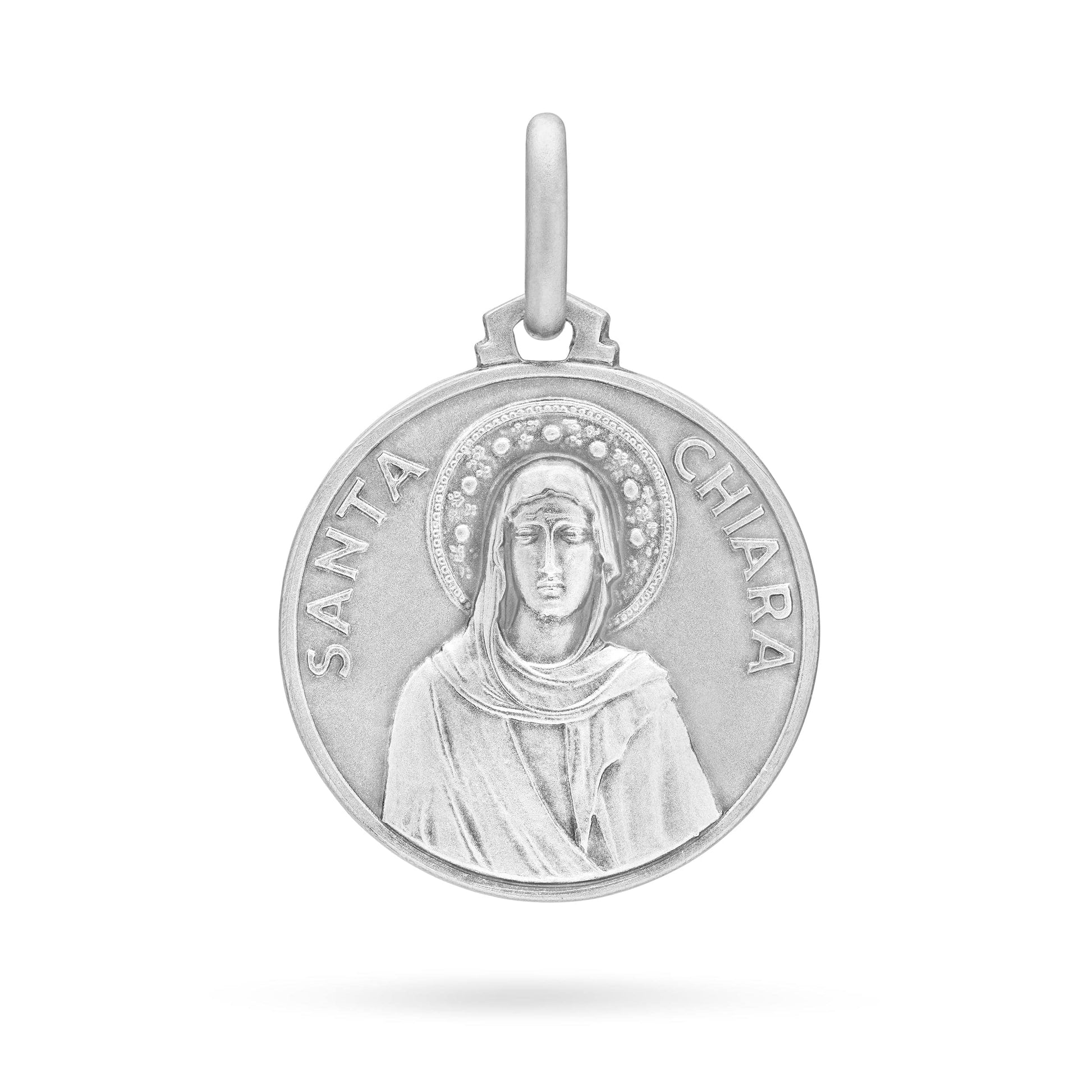 Medaglia in argento 925 di Santa Chiara. Fondatrice dell'ordine delle Clarisse. Canonizzata nel 1258 e dichiarata santa nel 1958. Santa patrona della televisione e delle telecomunicazioni.