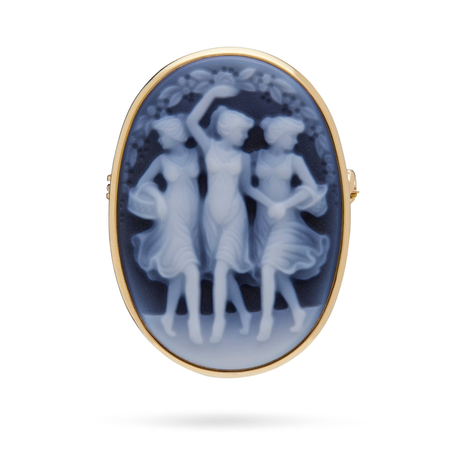 Spilla E Pendente Ovale in Oro Giallo Con Cammeo in Agata Nera Raffigurante Le Tre Grazie