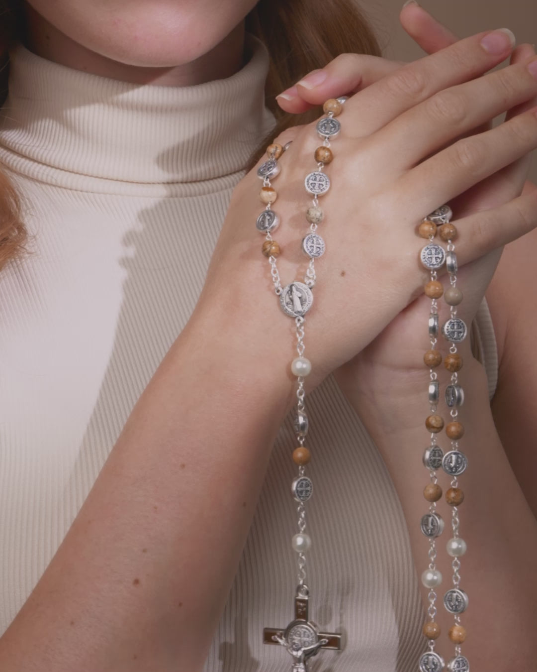 Doppia medaglia smaltata raffigurante San Benedetto da un lato e la sua croce dall'altro. Crocifisso di San Benedetto smaltato marrone, medaglia centrale di San Benedetto. Il rosario è composto da grani di vera pietra paesina alternati a grani di San Benedetto in peltro.