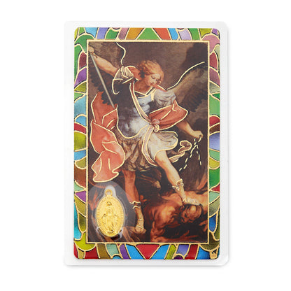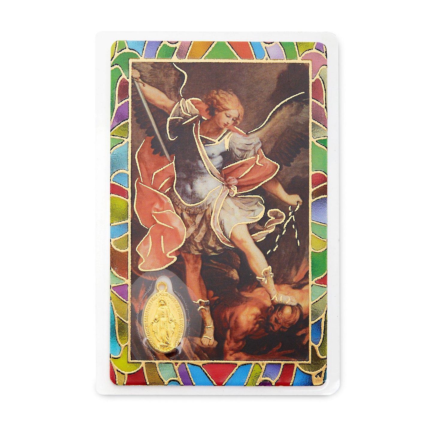 Santino in PVC con immagine di San Michele Arcangelo, impreziosito da dettagli in colore oro e una medaglia in metallo dorato della Madonna Miracolosa. Sul retro è riportata la frase "Prega per noi" in italiano, inglese, spagnolo, portoghese, polacco e francese. Portalo sempre con te!