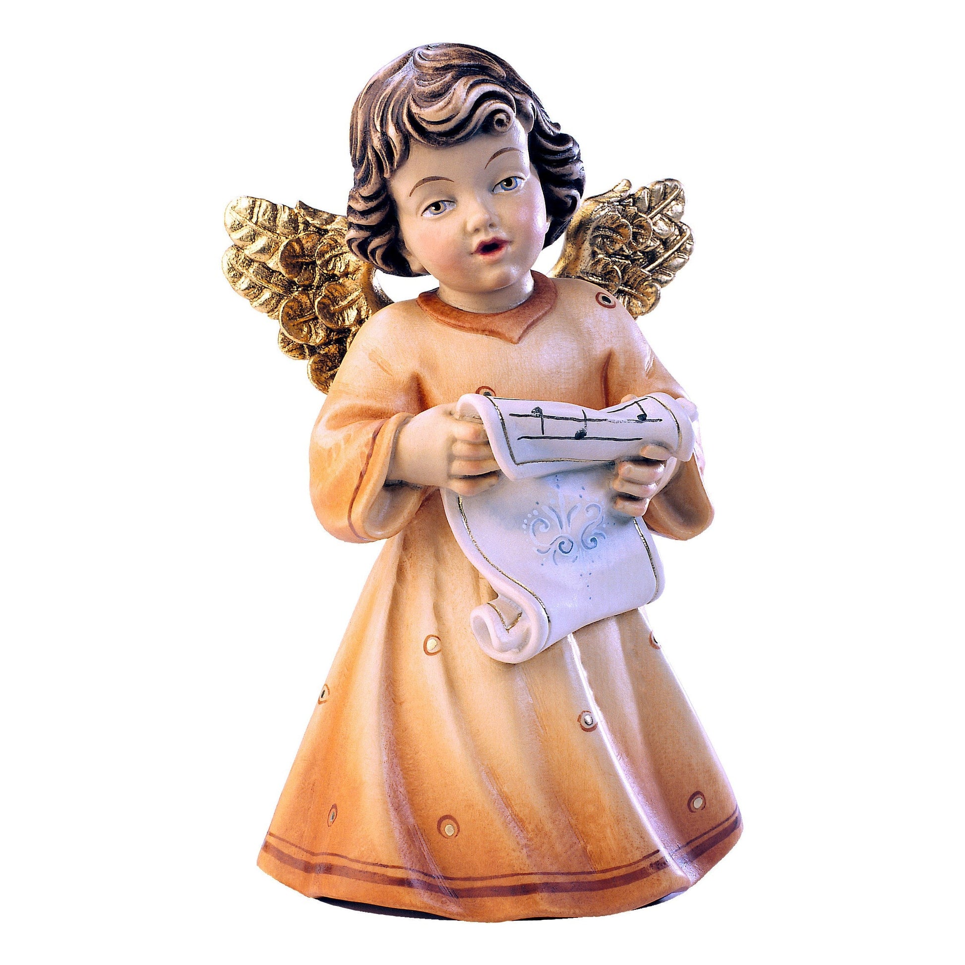 Statua in legno Angelo Sissi che canta. Questa statua è stata realizzata artigianalmente in Val Gardena, intagliata e decorata a mano, seguendo le tecniche tramandate sin dal XVII secolo.