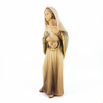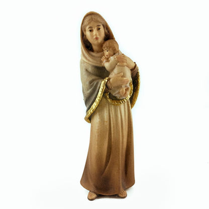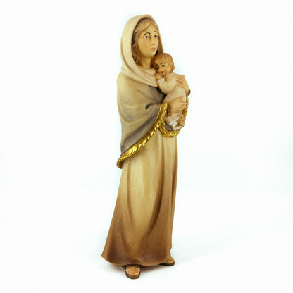 Statua della Madonna di Ferruzzi in Legno, intagliata e dipinta a mano in Alto Adige. Riproduzione moderna del famoso dipinto della Vergine del Riposo, carattterizzata dall'utilizzo di colori tenui, linee morbide. Tenerissimo il Bambin Gesù.