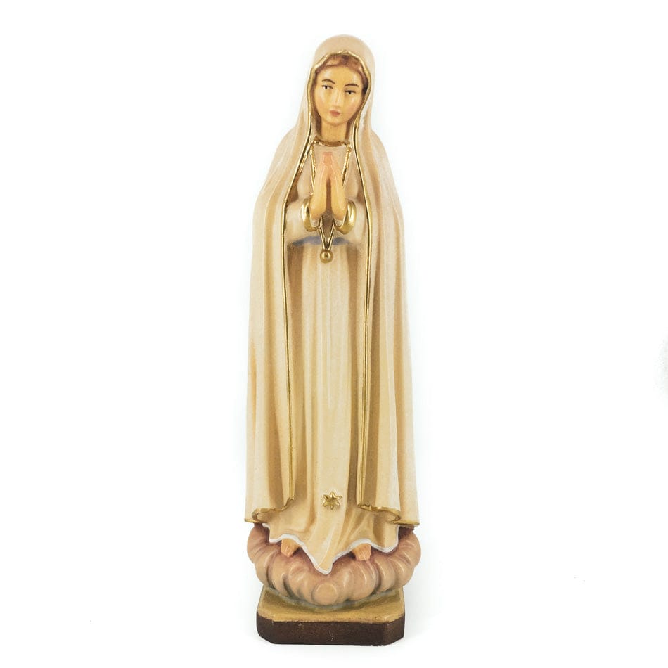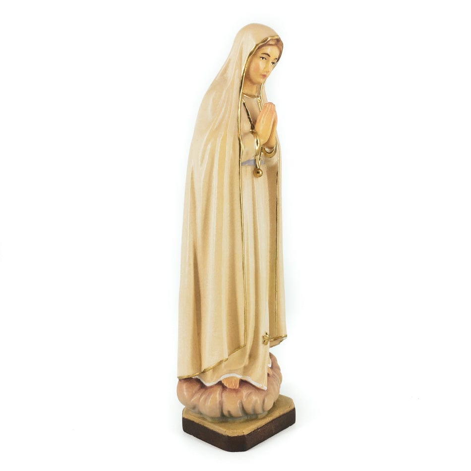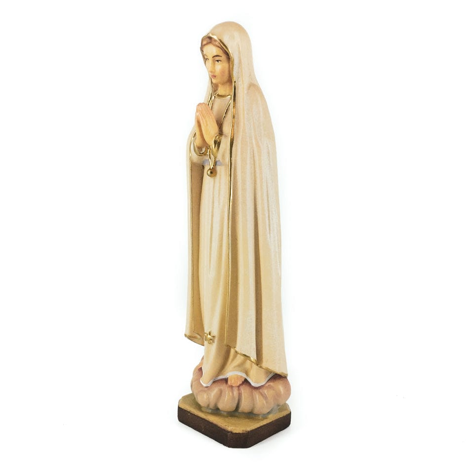 Statua della Vergine di Fatima in legno scolpita e dipinta a mano nella Val Gardena. Scultura rappresentante la Madonna Portoghese con mani giunte, dettaglio della collana con ciondolo, riportante la descrizione data dai tre Pastorelli durante l'Apparizione.