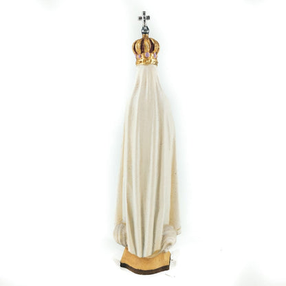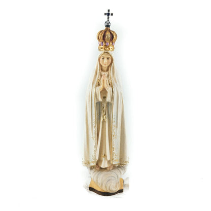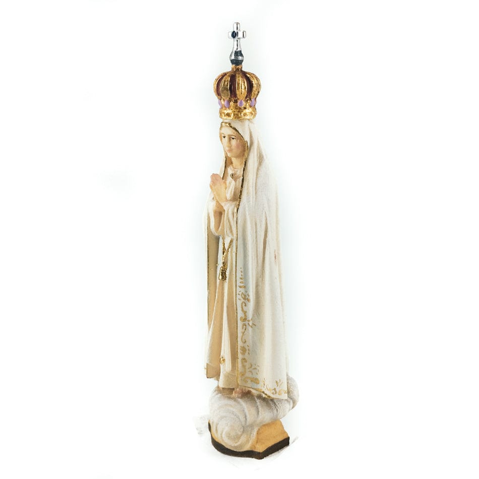 Scultura in legno della Vergine di Fatima dipinta e scolpita nel Nord Italia. Particolare attenzione riveste la Coroncina portata dalla Vergine, riproduzione in miniatura della Corona di Pietre Preziose che venne donata dall e Donne Portoghesi alla Vergine come ringraziamento per il mancato arruolamento dopo la Fine della Guerra Mondiale.