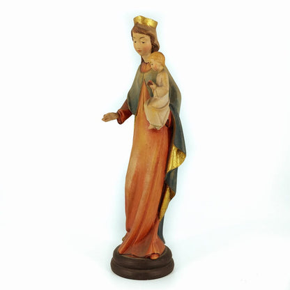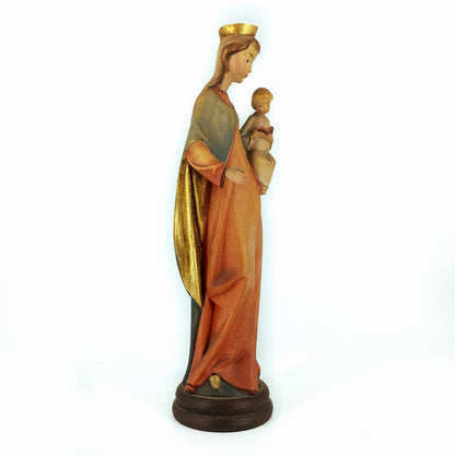 Statua della Madonna Ausiliatrice in Legno, intagliata e dipinta a mano in Alto Adige. Scultura stilizzata della Vergine Ausiliatrice, dal latino Auxilium Christianorum ovvero Ausilio dei Cristiani, la cui devozione divenne più diffusa grazie a San Giovanni Bosco nel 1862. La Vergine è qui rappresentata nelle sue vesti Tradizionali, Manto blu e Tunica Rossa in versione Leggiadra e Filiforme. Le linee allungate e morbide associate al panneggio delle Vesti conferiscono eleganza alla Scultura.