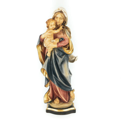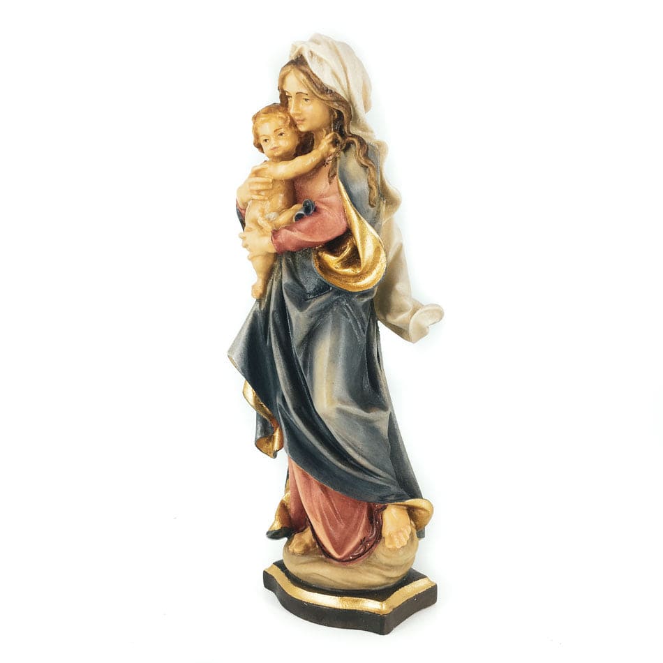 Statua della Madonna col Bambino, 20 cm, scolpita in legno. Tenerissima rappresentazione della Vergine Maria con il Bambino tra le braccia. La scultura mette in risalto l'atto della Maternità e la Protezione di una Madre verso il proprio Figlio. il Piccolo Gesù Bambino appare avvolto dalla Veste della Madonna, la Veste come Simbolo di Protezione.