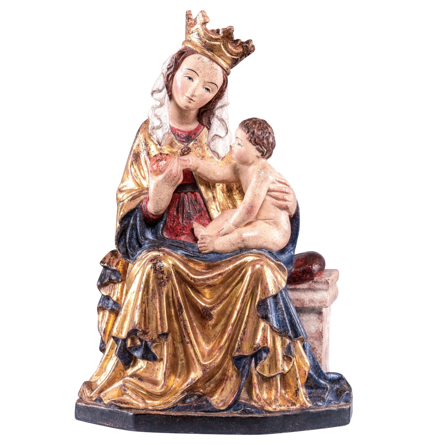 Statua in legno Madonna di Seeon. Questa magnifica statua è stata interamente lavorata a mano in Val Gardena, seguendo le tradizionali tecniche scultoree tipiche della regione altoatesina, nota per la sua storica tradizione nella lavorazione del legno risalente al XVII secolo.