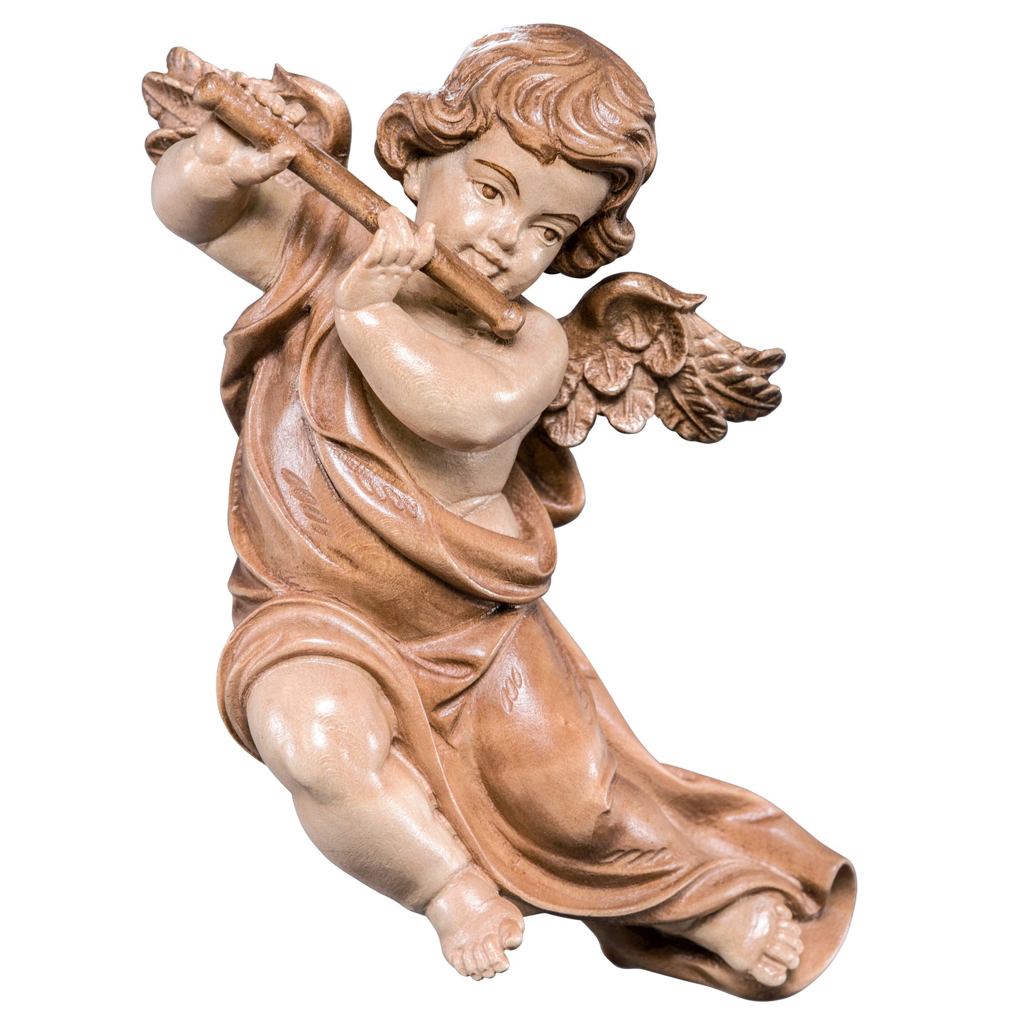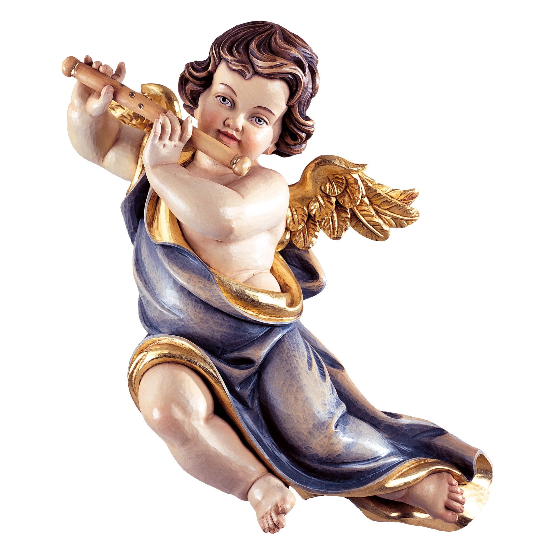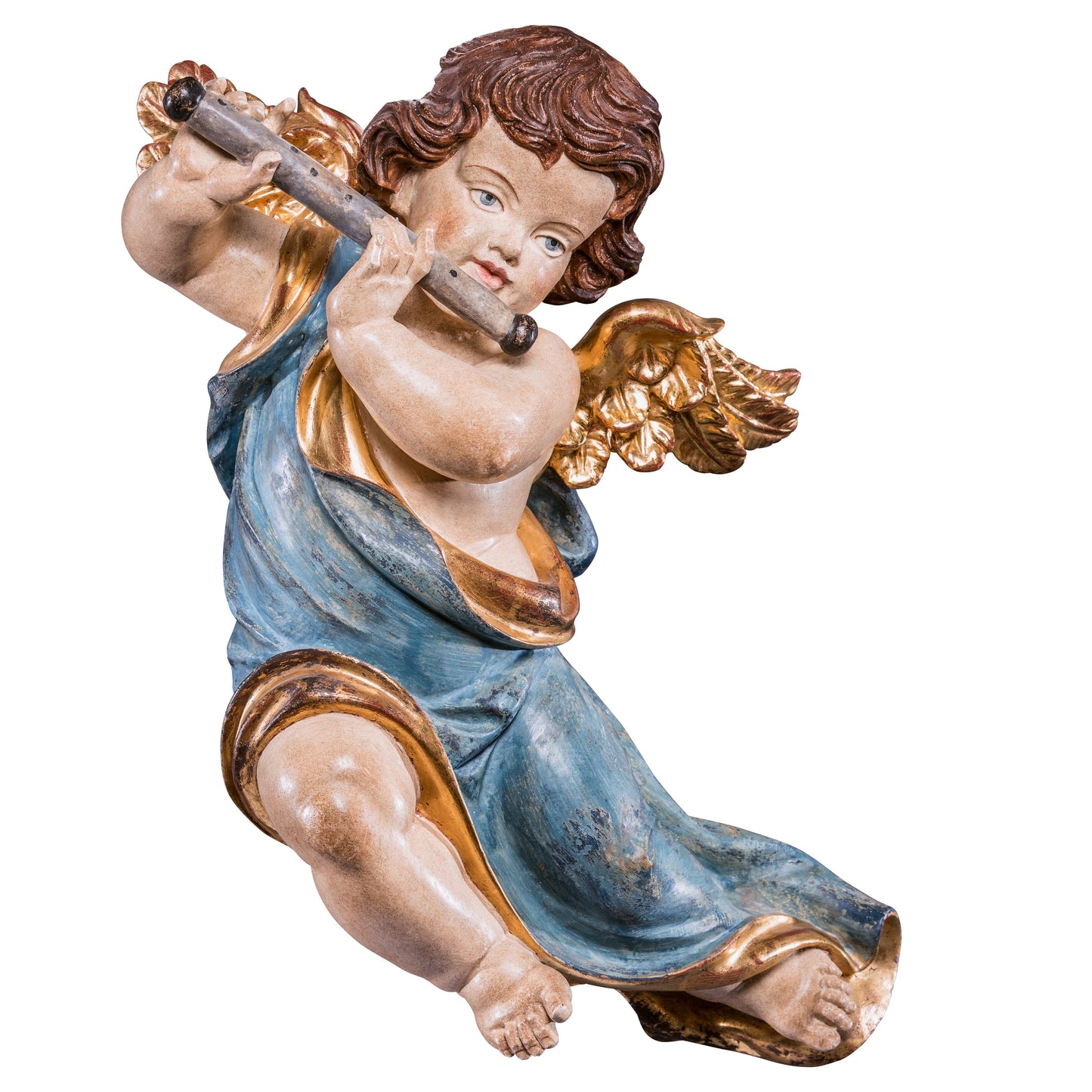 Statua in legno Putto mariano con flauto. Questa magnifica statua è stata interamente lavorata a mano in Val Gardena, seguendo le tradizionali tecniche scultoree tipiche della regione altoatesina, nota per la sua storica tradizione nella lavorazione del legno risalente al XVII secolo.