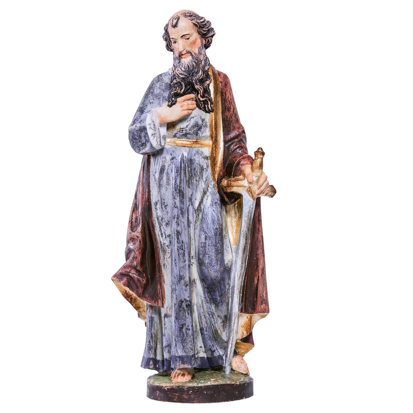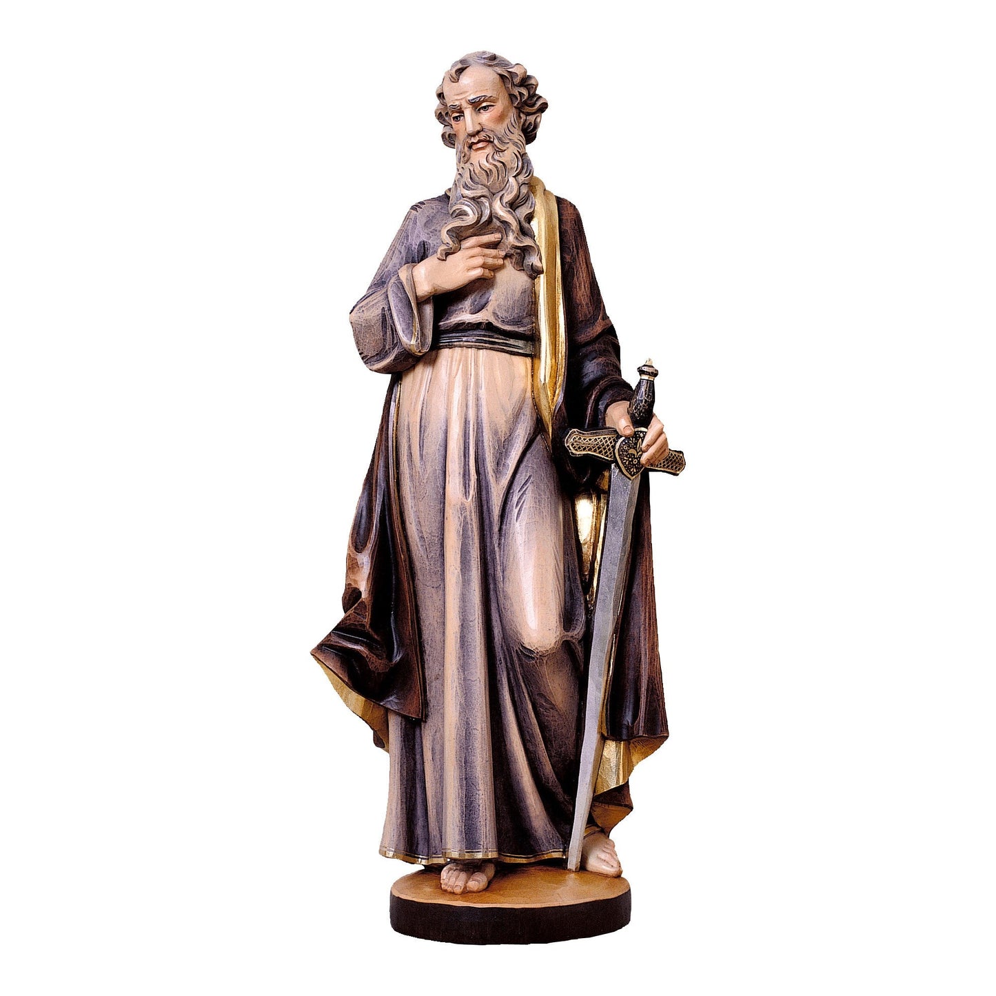 Statua in legno S. Paolo. Questa statua è stata realizzata artigianalmente in Val Gardena, intagliata e decorata a mano, seguendo le tecniche tramandate sin dal XVII secolo.