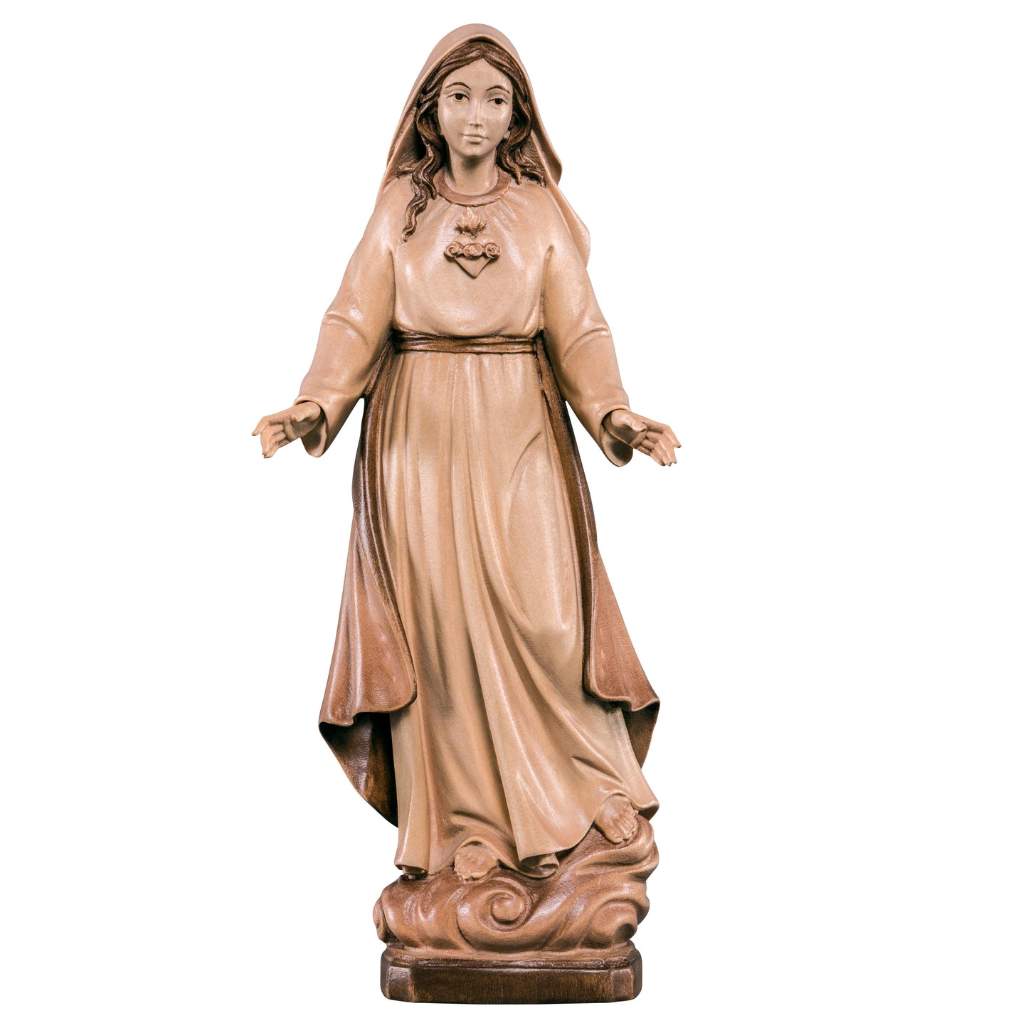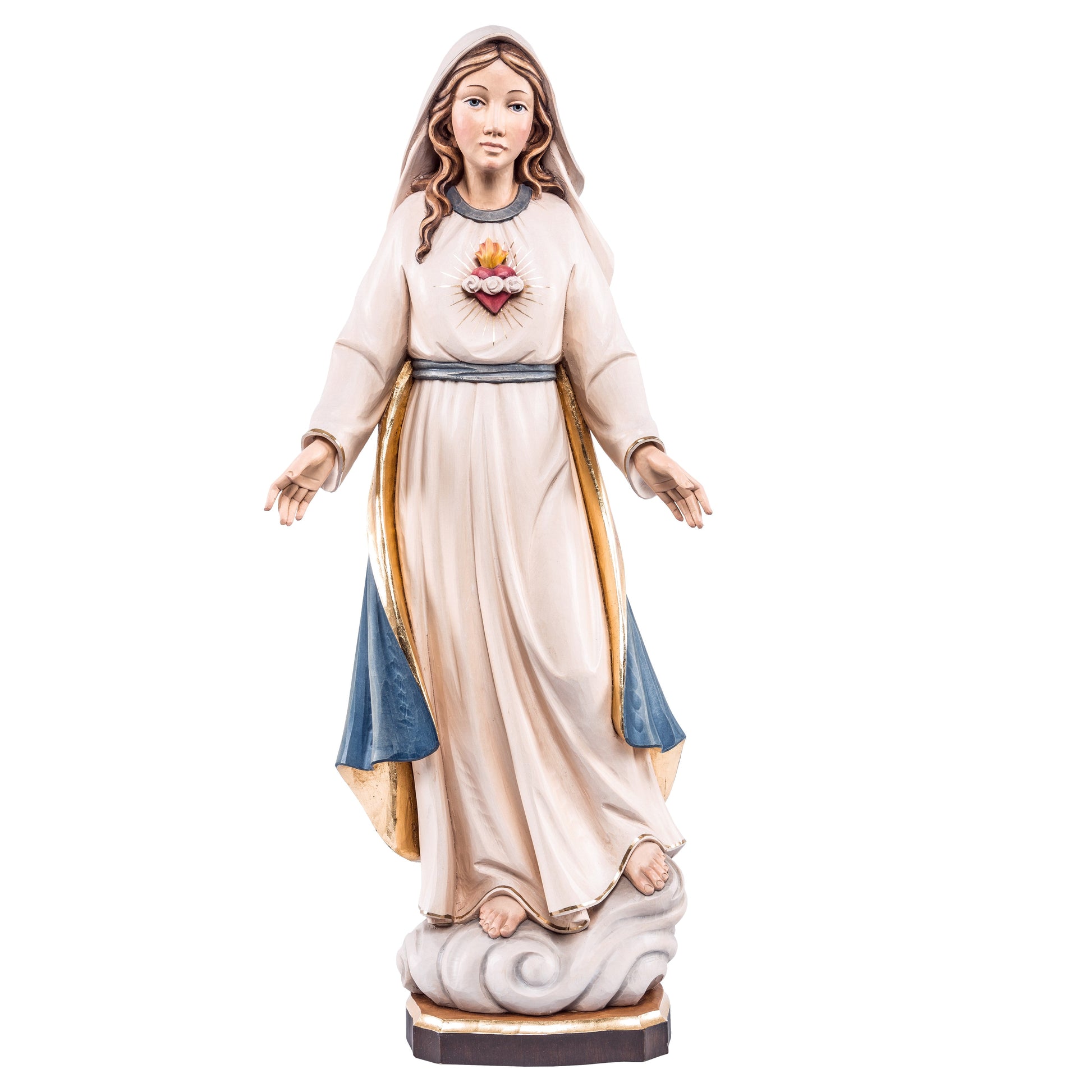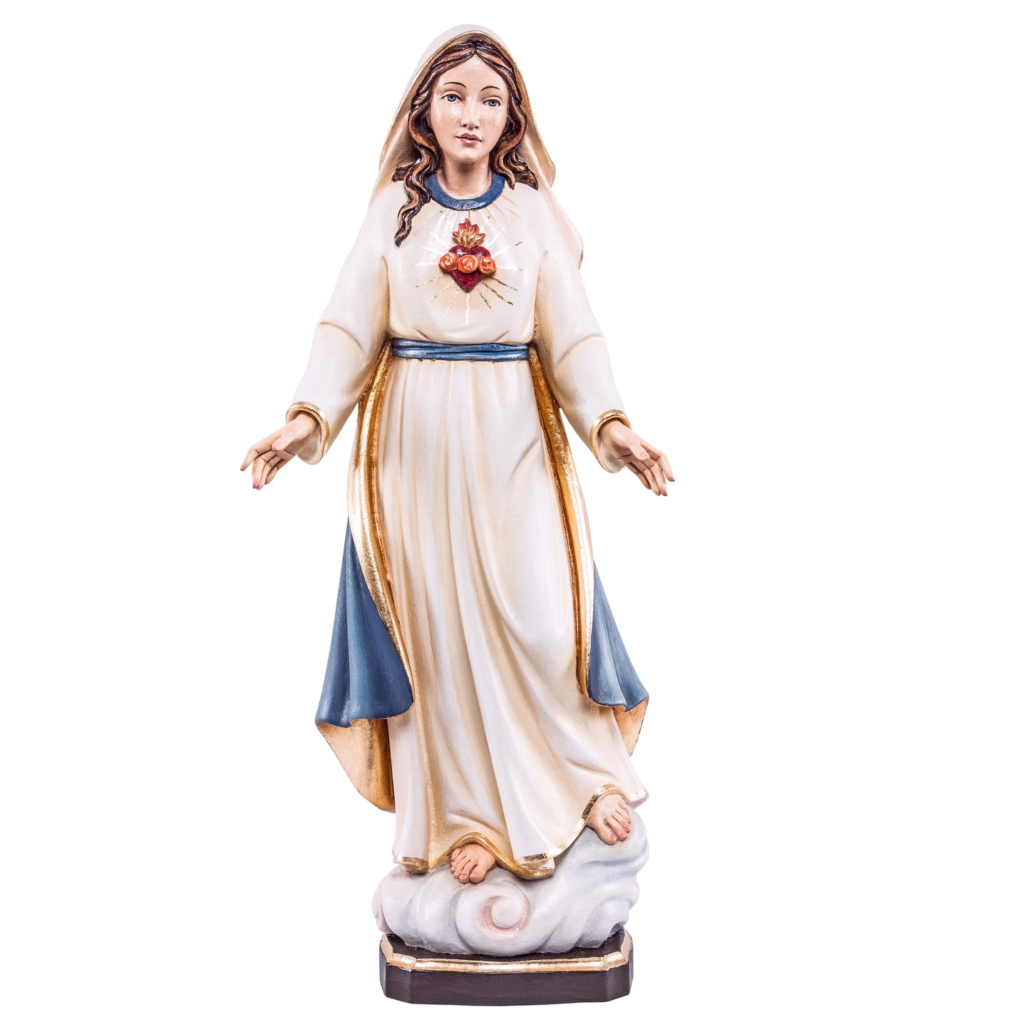 Statua in legno Sacro cuore di Maria. Questa statua è stata realizzata artigianalmente in Val Gardena, intagliata e decorata a mano, seguendo le tecniche tramandate sin dal XVII secolo.