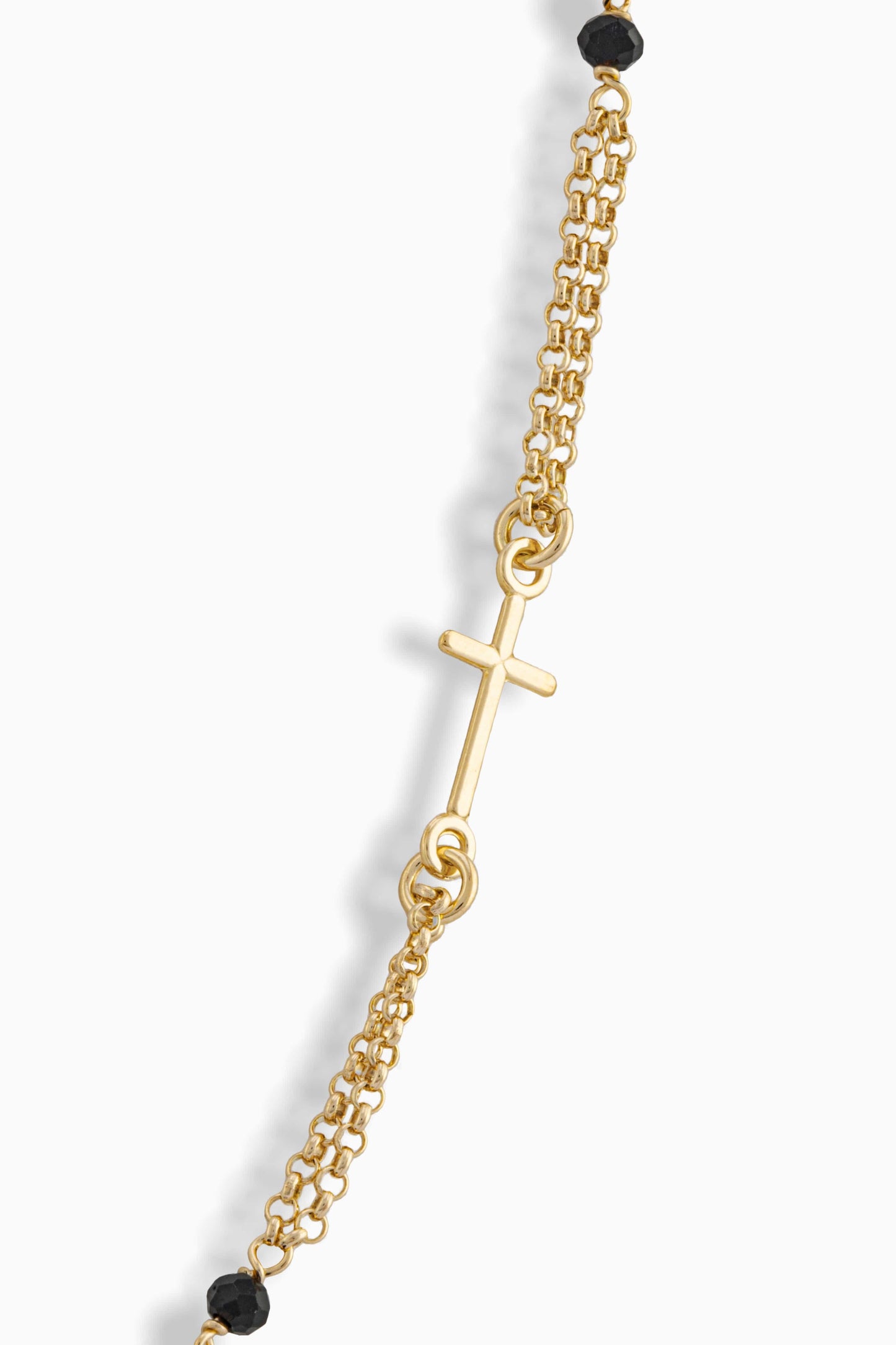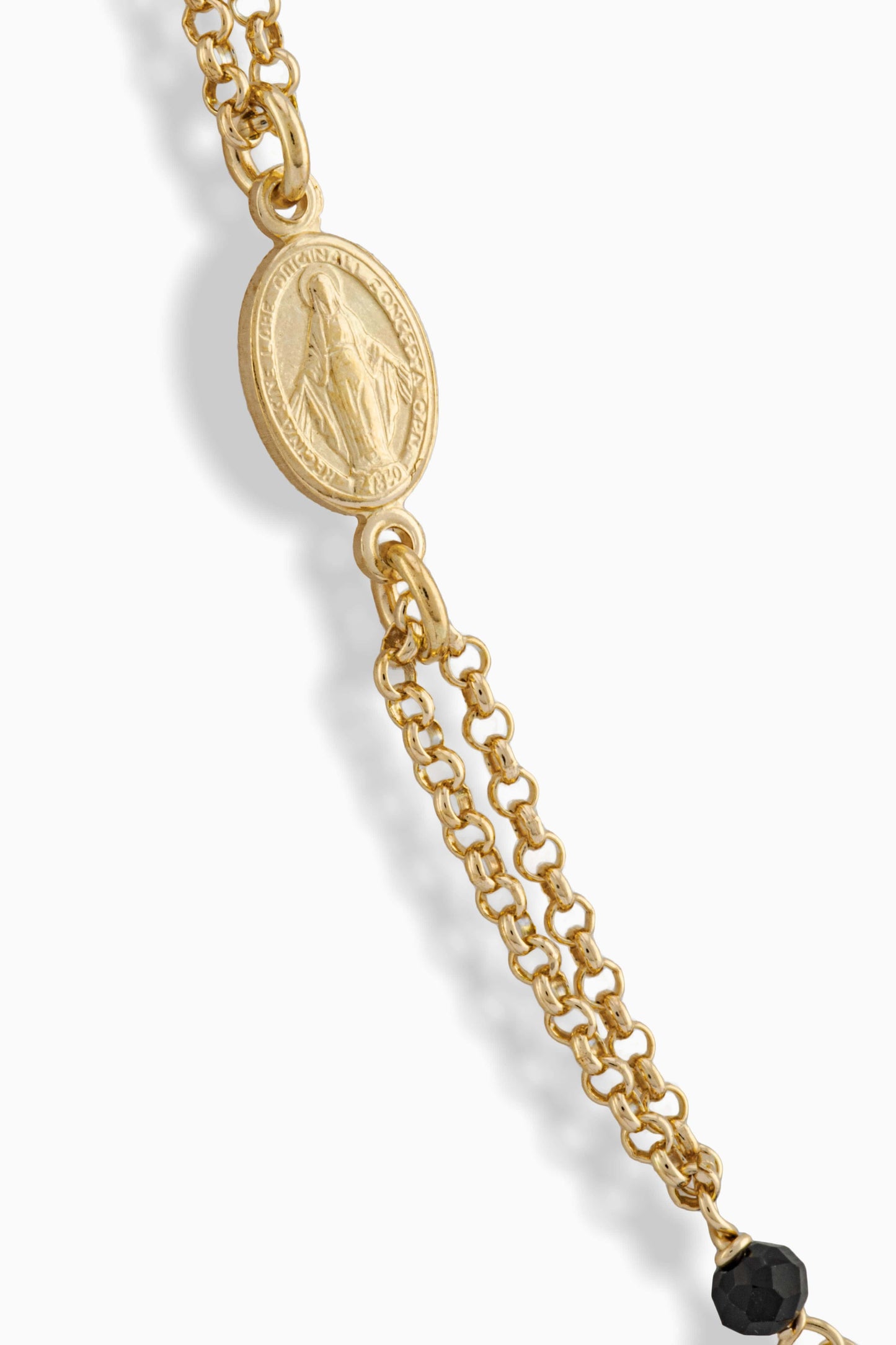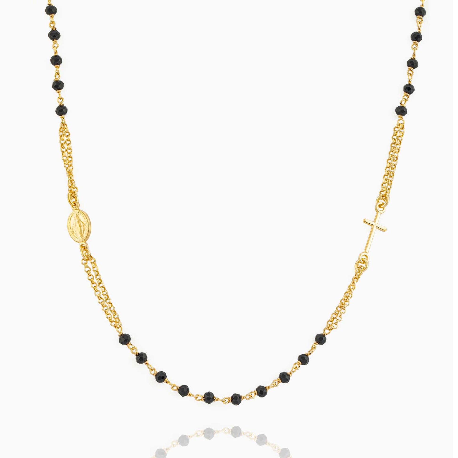 Collana realizzata in Argento 925 con preziosi Grani in Vetro Perlato e Cristalli Bianchi. Il girocollo presenta una medaglia della Vergine Miracolosa ed una semplice Croce senza Corpo.