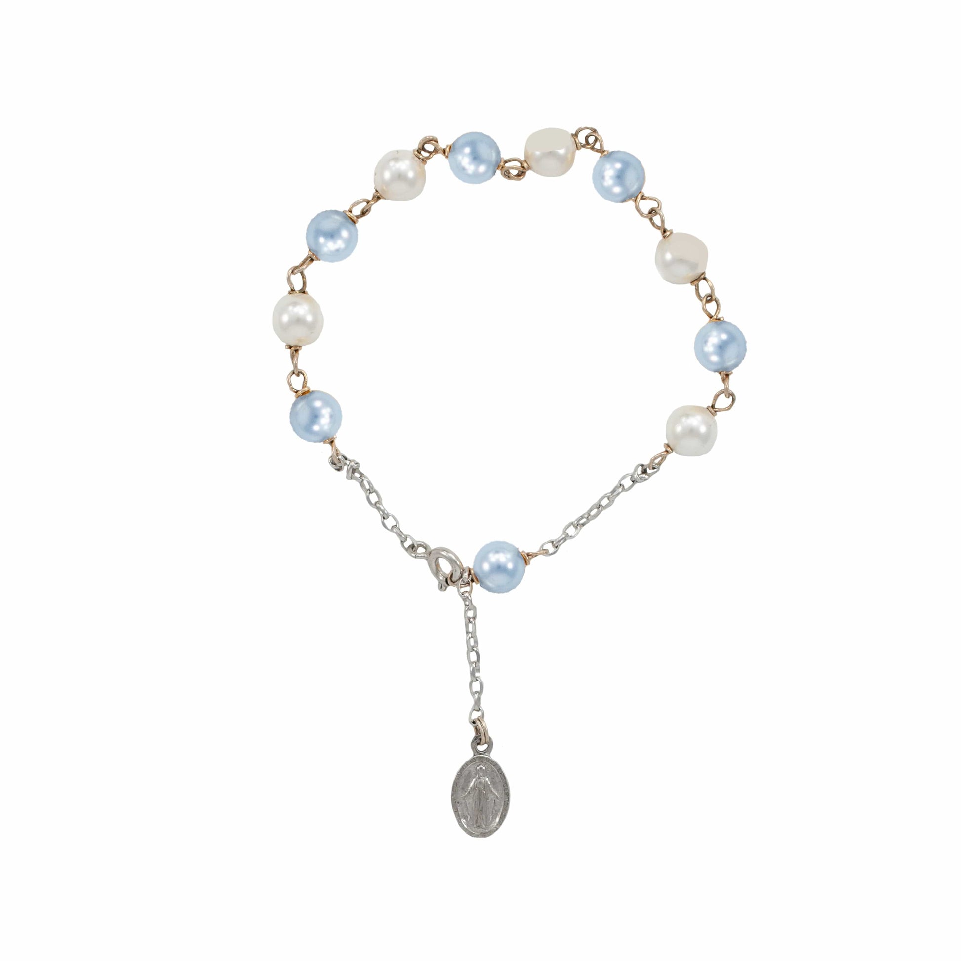 Bracciale Rosario con catenina regolabile in Argento 925 realizzato con Grani in Perla Swarovski Bianche e Celesti. Le Perle di Cristallo Swarovski sono repliche perfette di perle autentiche. Il Bracciale presenta una Medaglia della Madonna Miracolosa.
