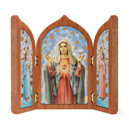 Trittico in Legno Con il Cuore Immacolato di Maria Ed Angeli