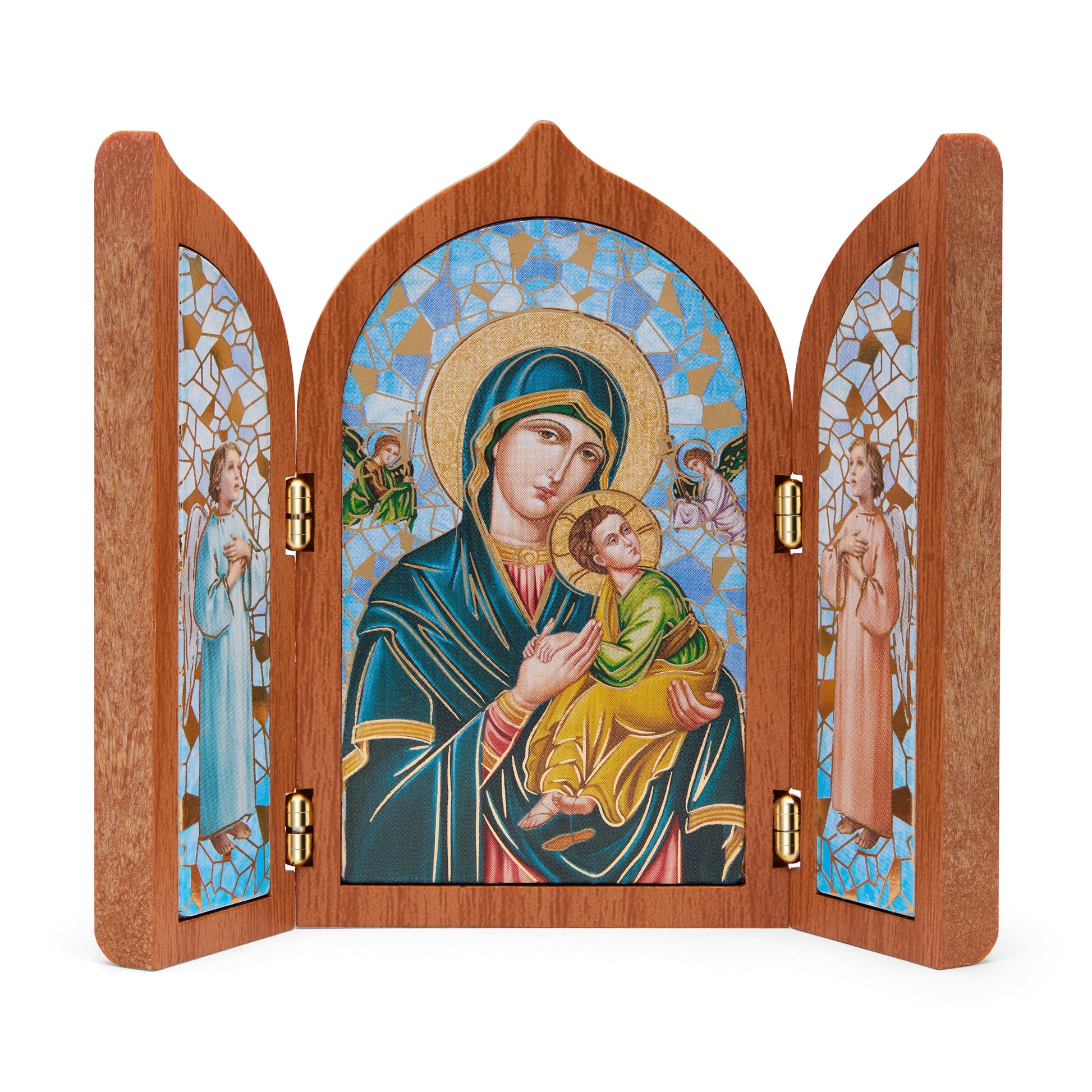 Trittico in Legno Con La Madre del Perpetuo Soccorso Ed Angeli