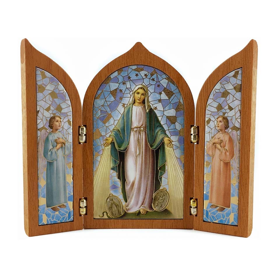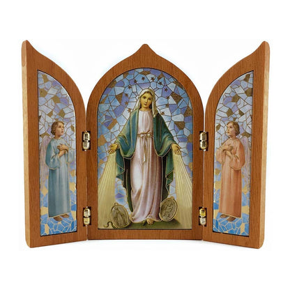Trittico in Legno Con Madonna Della Medaglia Miracolosa Ed Angeli