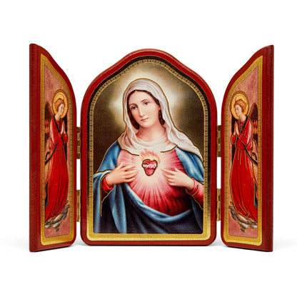 Trittico in Legno Rosso Con Cuore Immacolato di Maria E Angeli