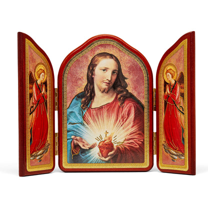 Trittico in Legno Rosso Con Sacro Cuore di Gesù E Angeli