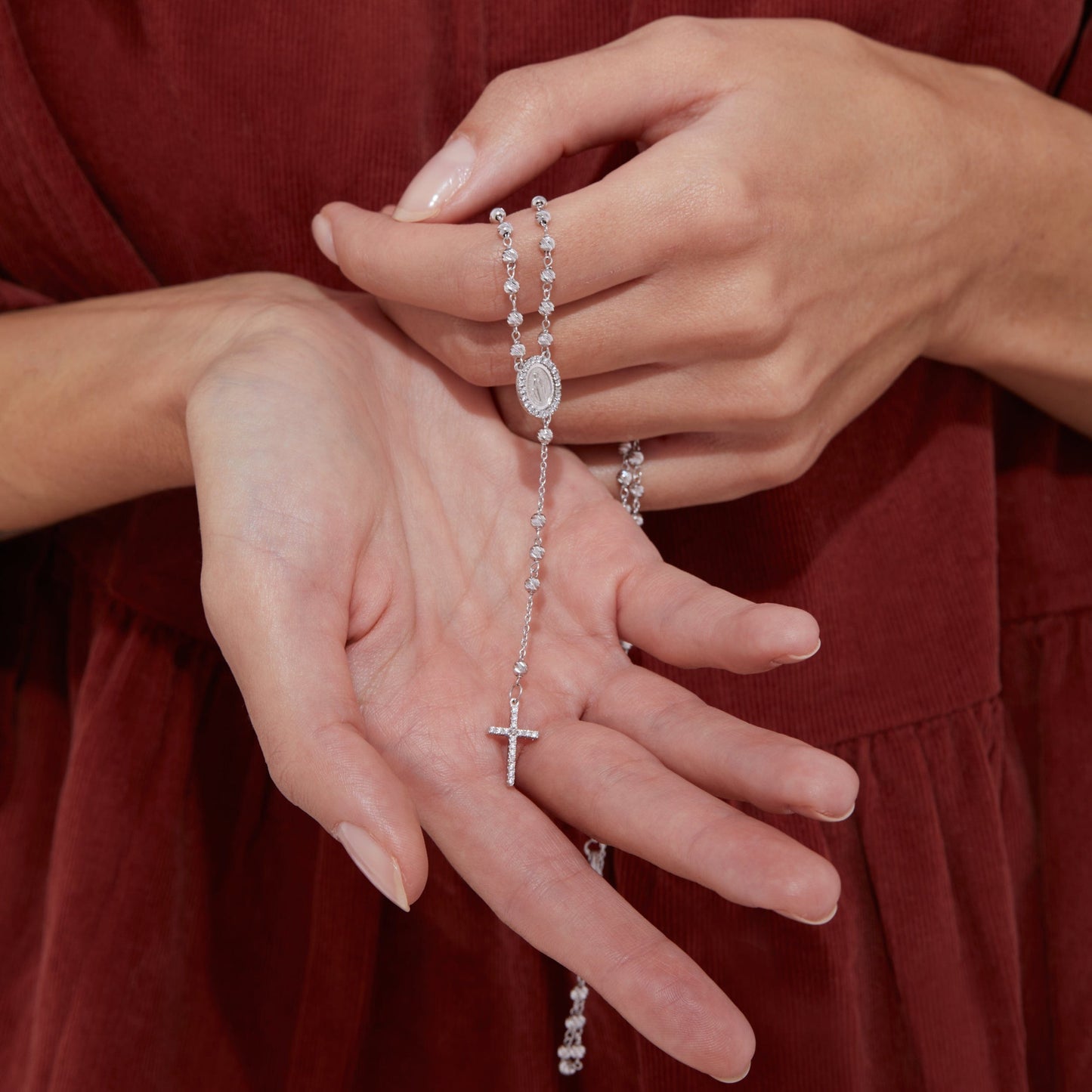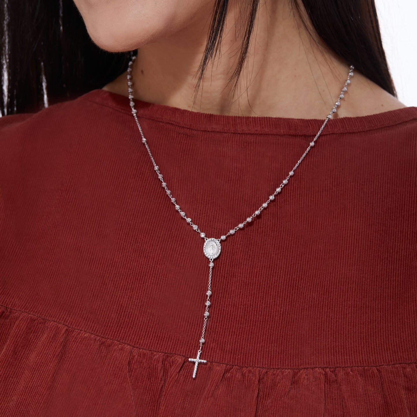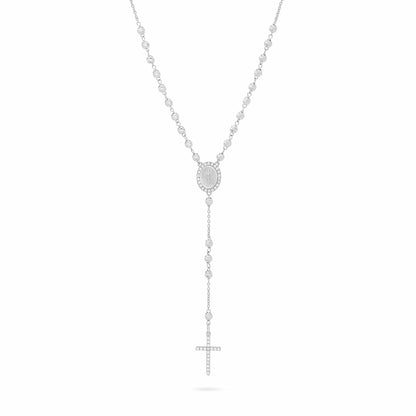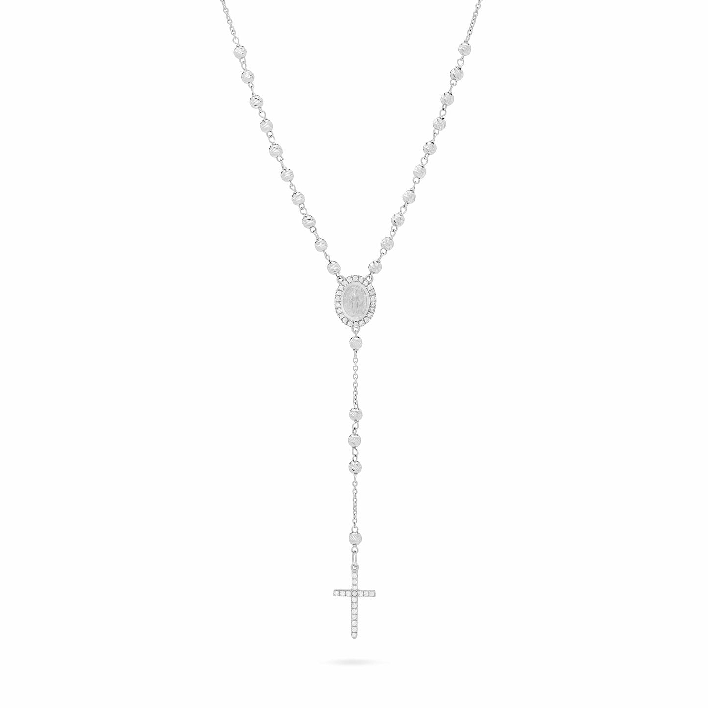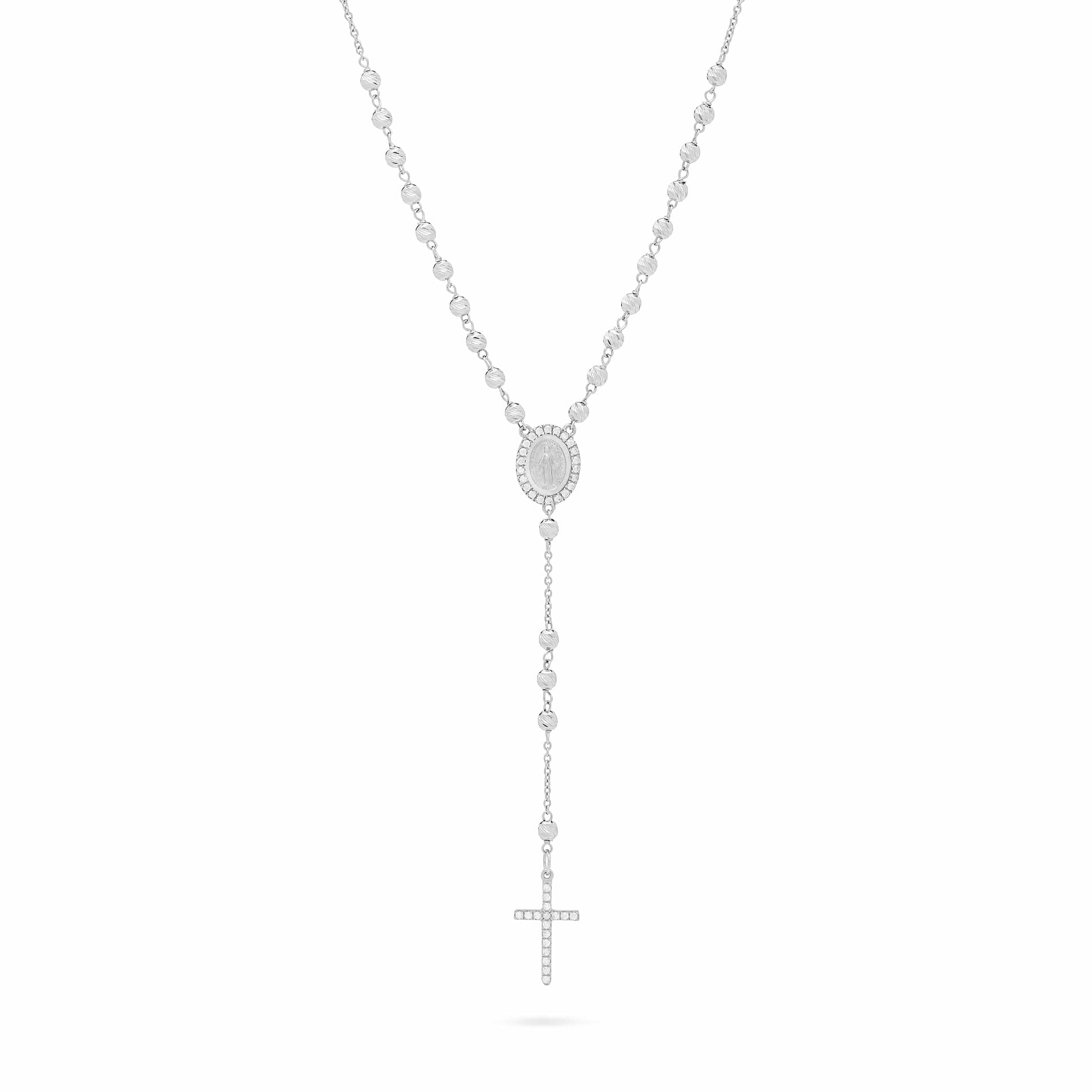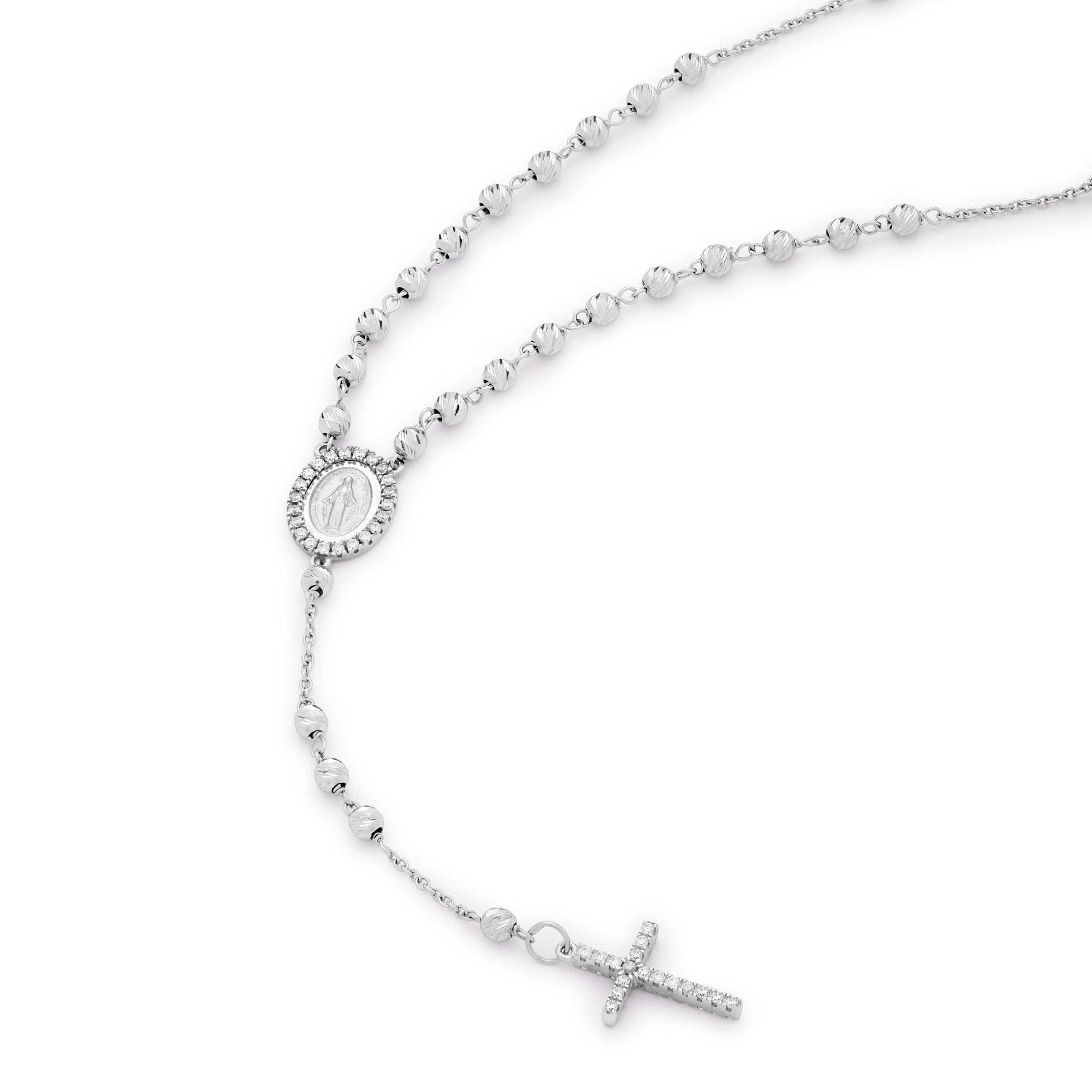 Rosario in oro bianco con grani sfaccettati da 3 mm. Croce in oro bianco con zirconi. Medaglia miracolosa con zirconi.