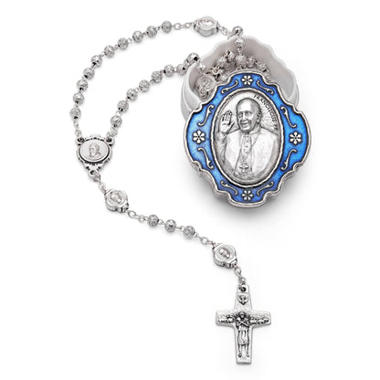 Blue Enameled Pope Francis Rosary Case With Rose-shaped Beads Rosary